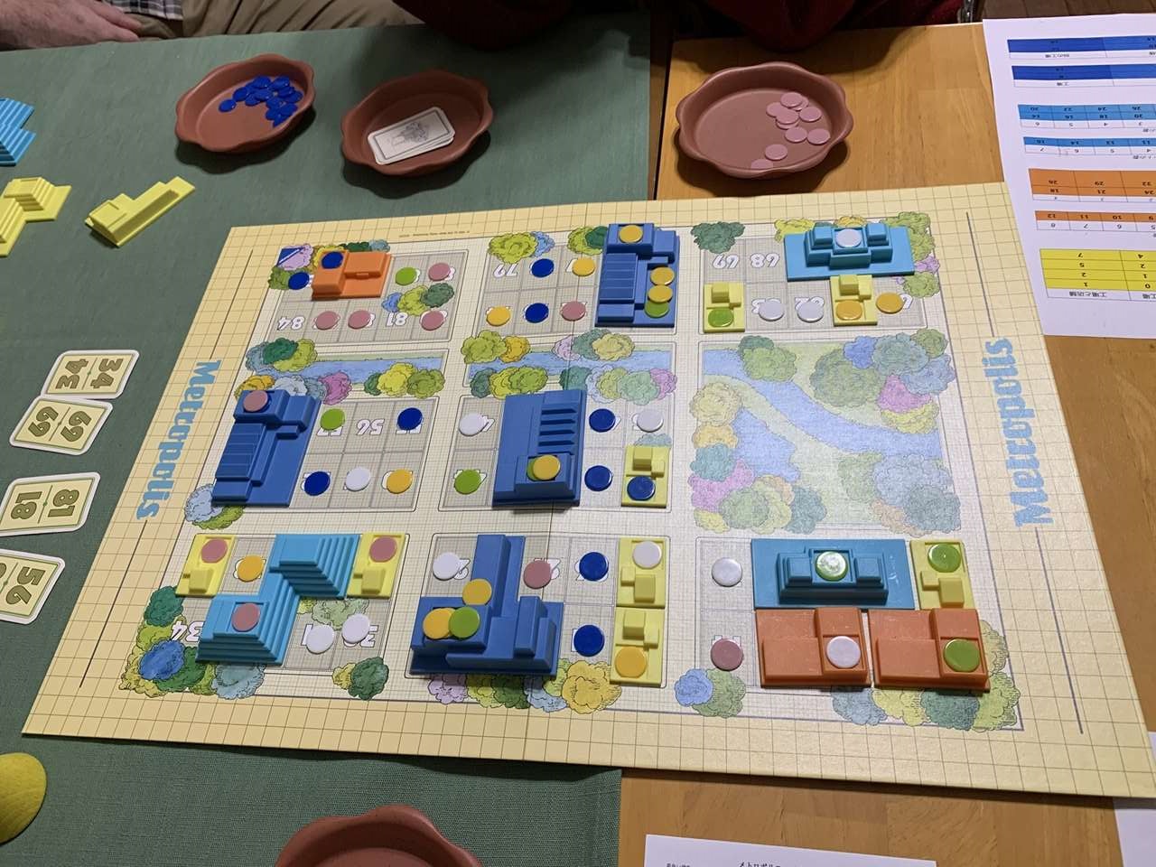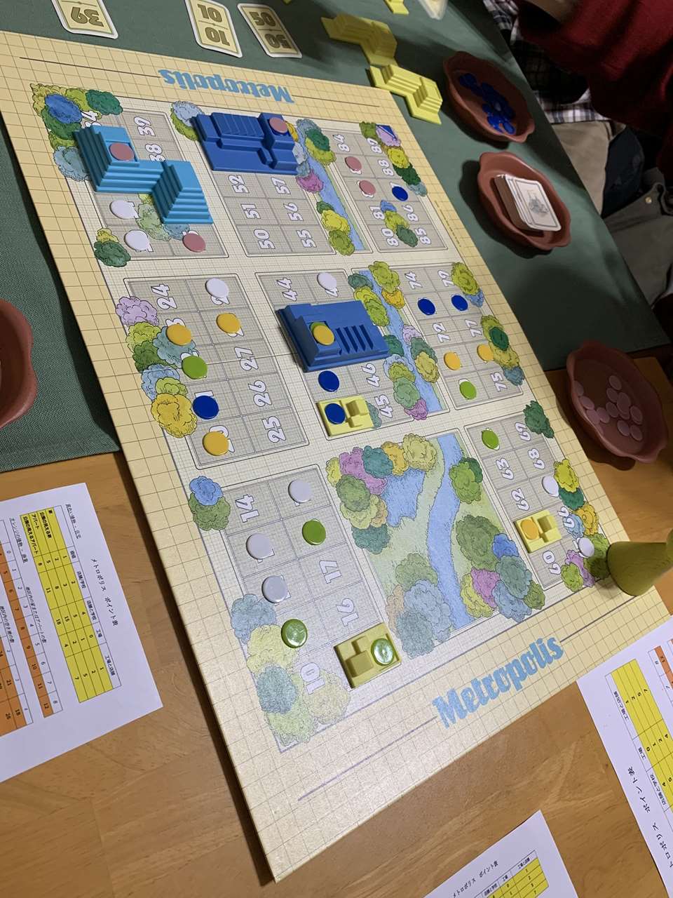ジャンクさん持ち込みの温故知新ゲーム第一弾だったかな。私がカタンをきっかけにボードゲームにはまった頃、既に絶版でボードゲーマーからの評価が高くプレミアがついているゲームがいくつかありました。「アクワイア」「アベカエサル」「メトロポリス」の3つで、前の2つはリメイクもされて遊べる機会が増えましたがこのゲームだけはなんとなく縁がなくてスルーしていたんですよねぇ、やっと遊べました! 交渉がメインのシステムが時代を感じます。土地代が無料なところは「チャイナタウン」も同じですね。このゲームのシステムを踏襲したのかなと感じます。勝者はジャンクさん、お見事でした。