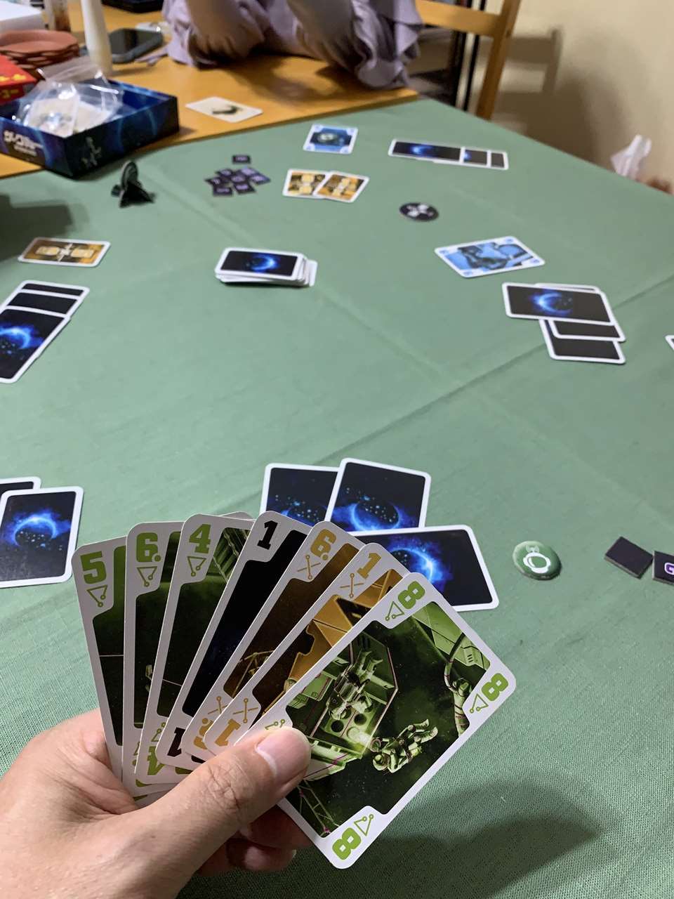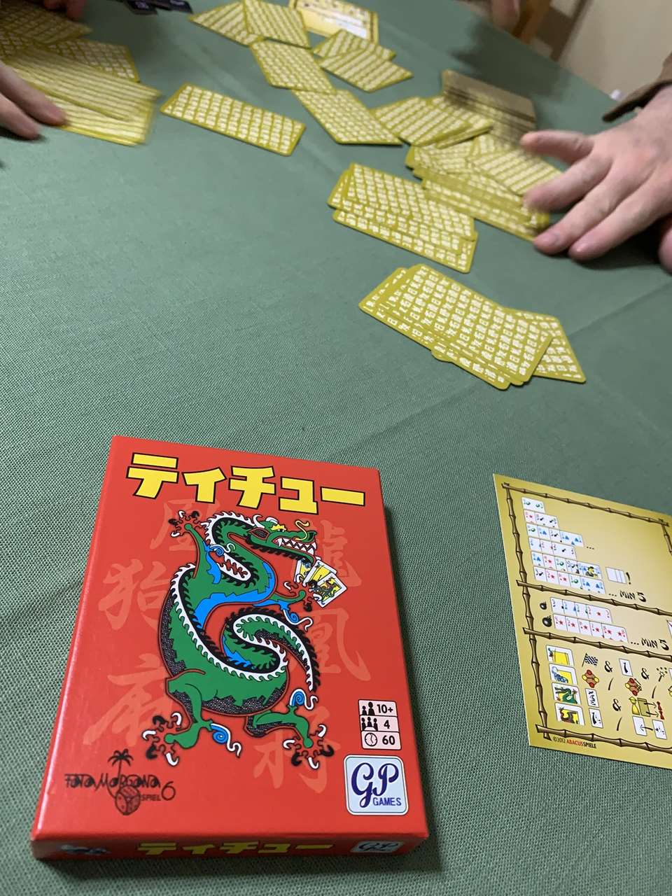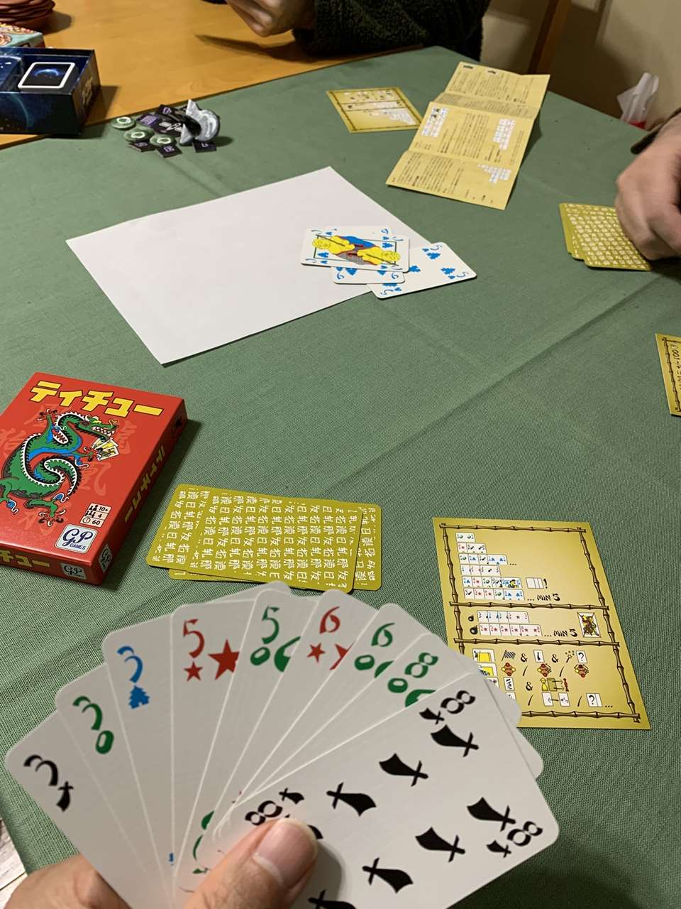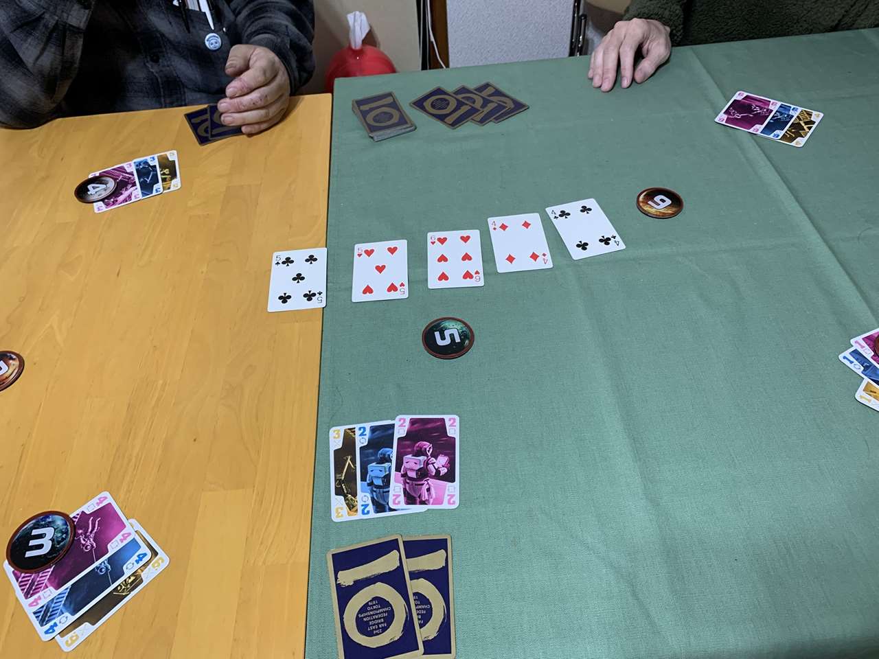 先日草場さん宅で遊んだ協力ゲームをここでも早速遊びました。コンポーネントはトランプとクルーを使って代替しています。ポーカーの役を知っていればすぐ遊べるところが良いですね。
