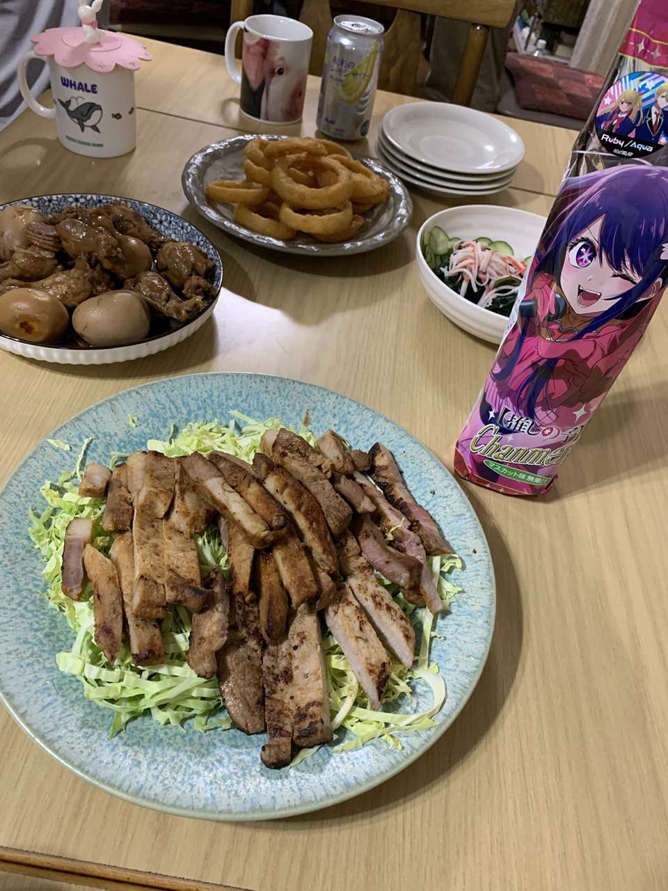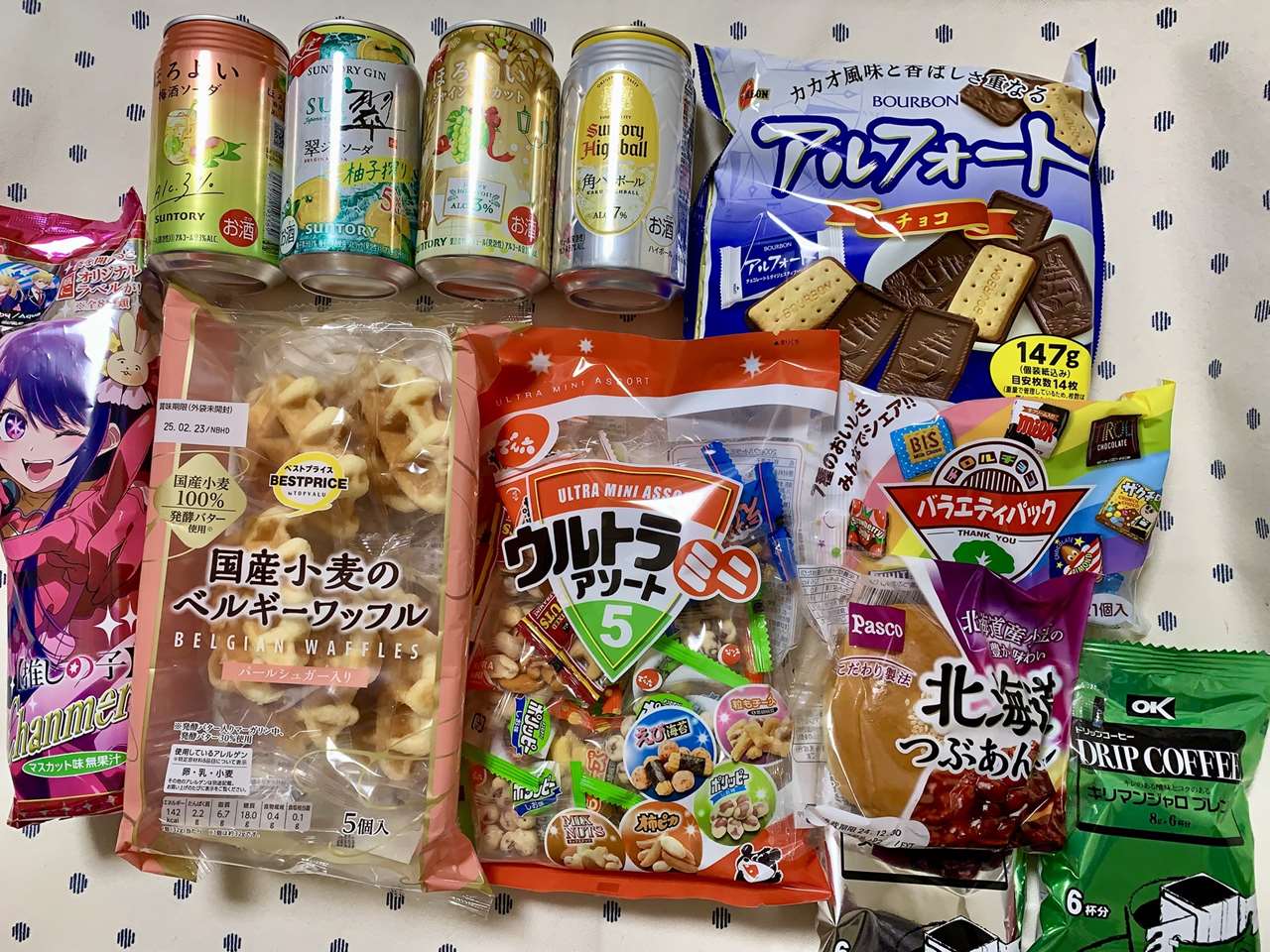 今回のデブ活持ち込み。シャンメリーと推しの子のコラボは普段寄らないスーパーをいくつか探してやっと見つけました。