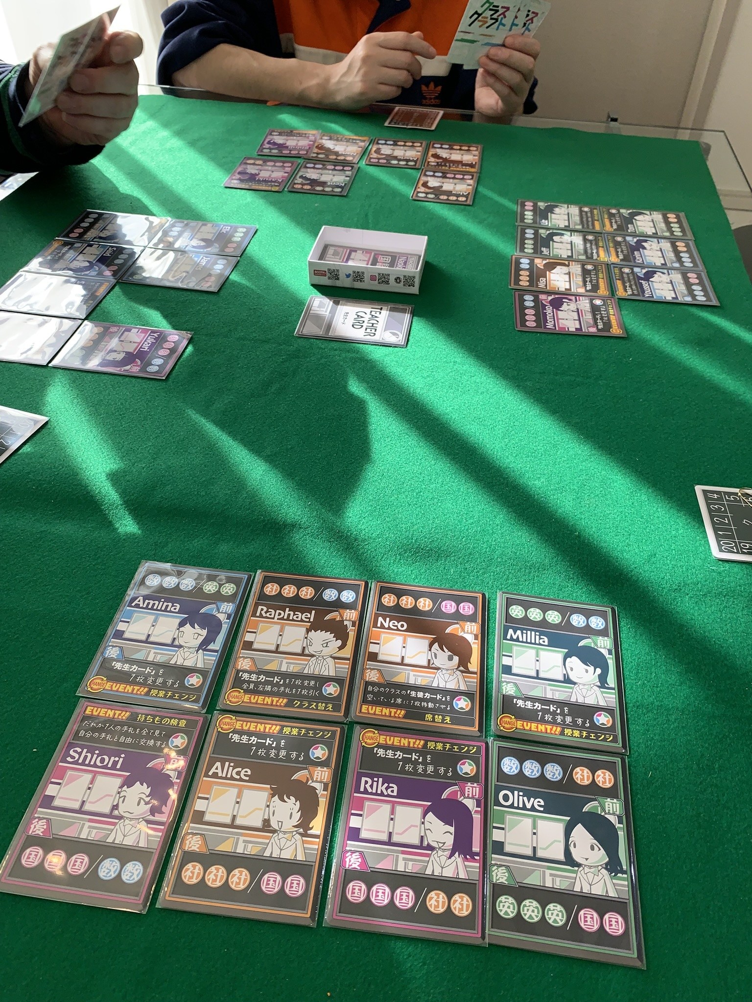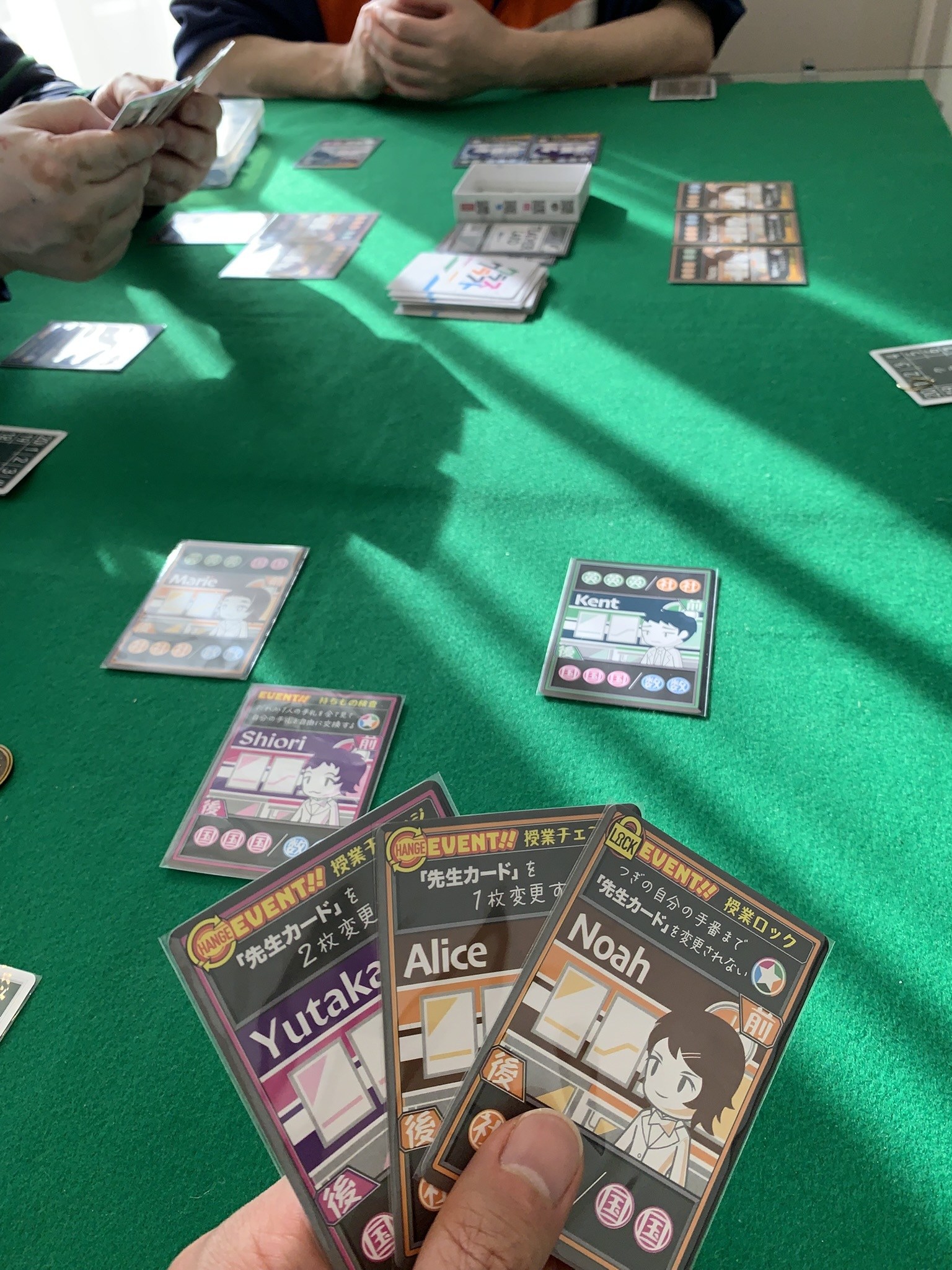 中間試験と期末試験に向けてクラスの生徒を集めていくカードゲーム。生徒は得意な教科があるので試験に合わせてうまく一致するよう集めるのがキモです。テーマとシステムが結構合っているところが良かったですね。勝者は先生、お見事でした。