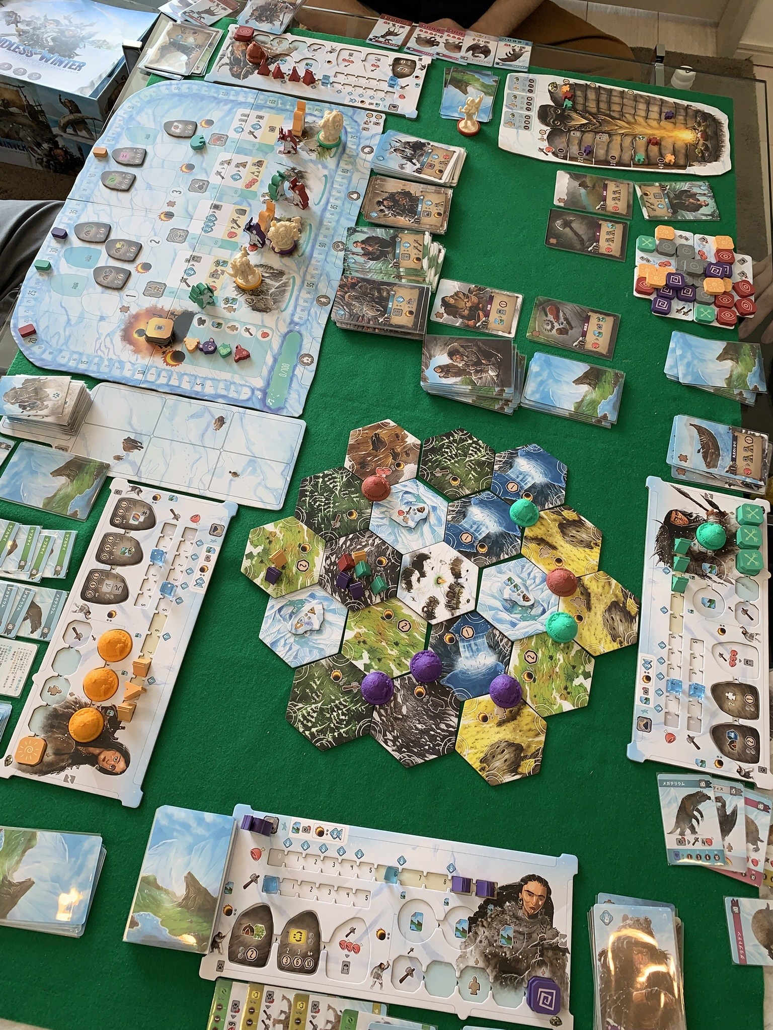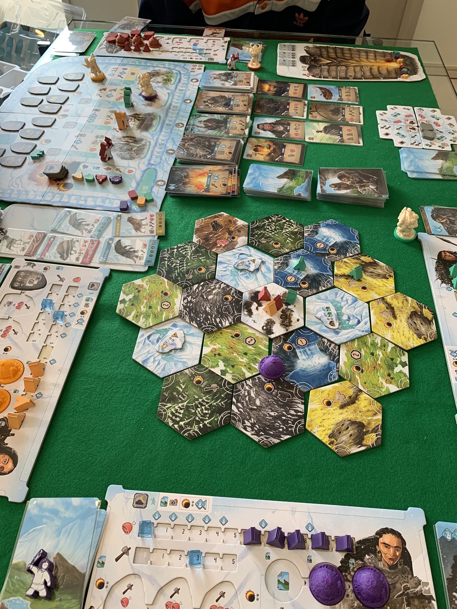 西フランクシリーズでおなじみのキャラクターデザインで個人的にとっつきやすいです。ゲームシステム的にはワーカープレイスとデッキ構築を軸に彫像トラックのレース、狩猟のセットコレクション、へクスマップへの村の建築、巨石タイル配置によるボーナス、他にもまだ得点要素があってとにかくてんこ盛りです。