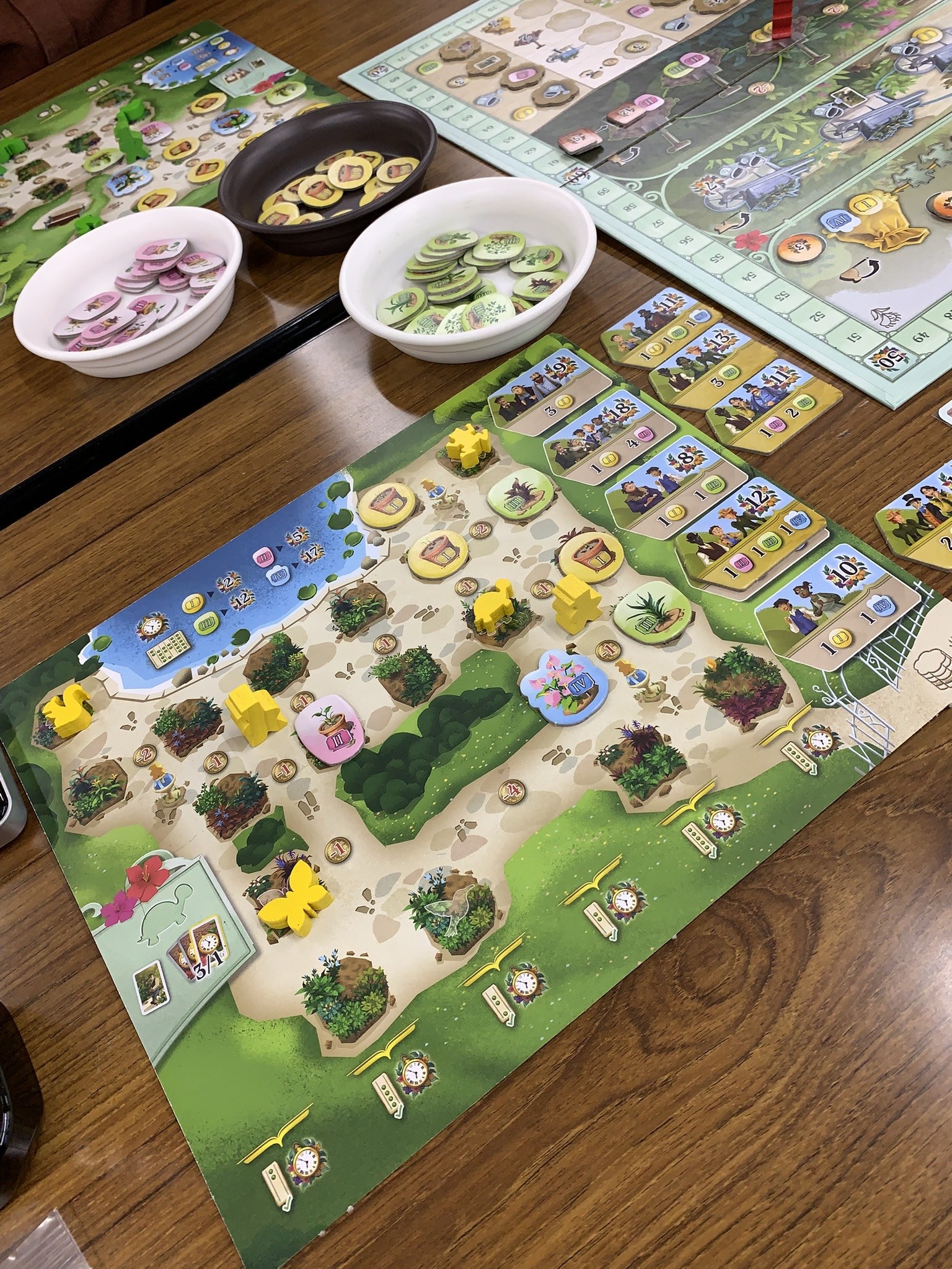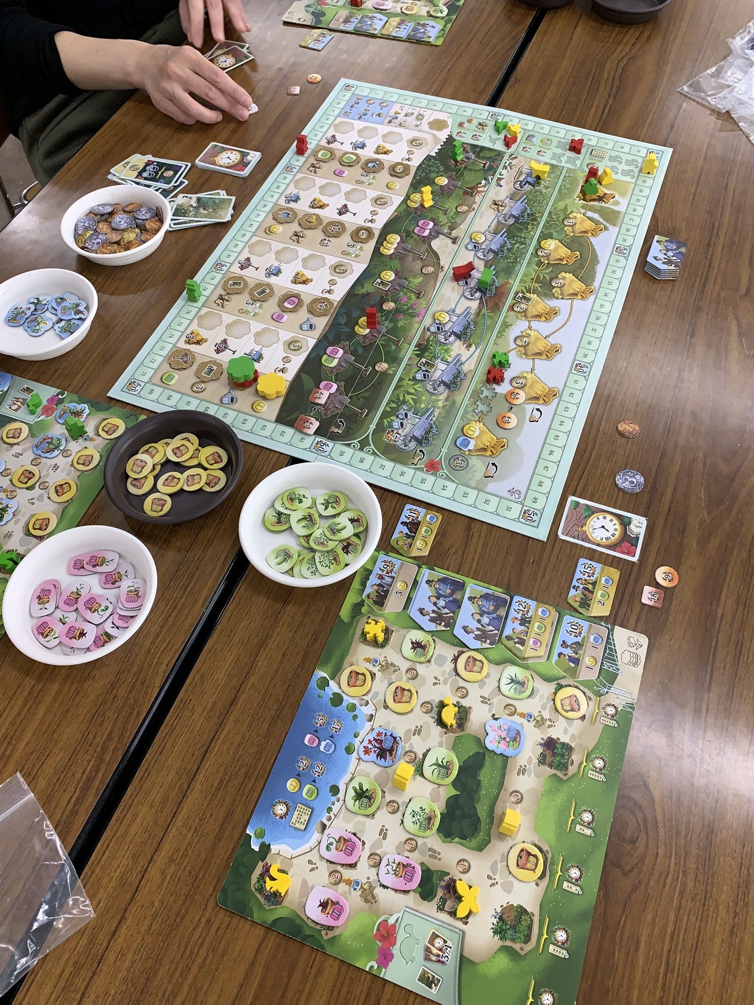 到着してまず最初はボタニクス。皆遊んだことがあるというので個人ボードを裏面にして拡張要素も追加して遊びました。説明は拡張要素の差分のみです。拡張を入れるとけっこう骨太な遊びがいのあるゲームになりますね。何度も遊べそうです。勝者はタケルさん、お見事でした。