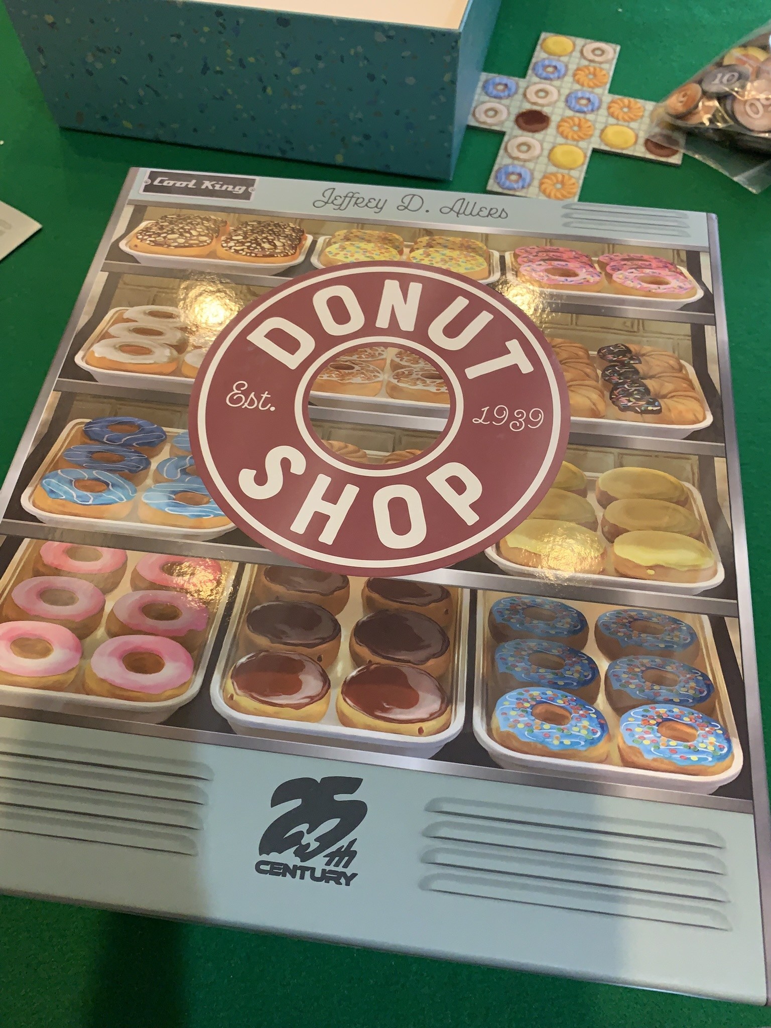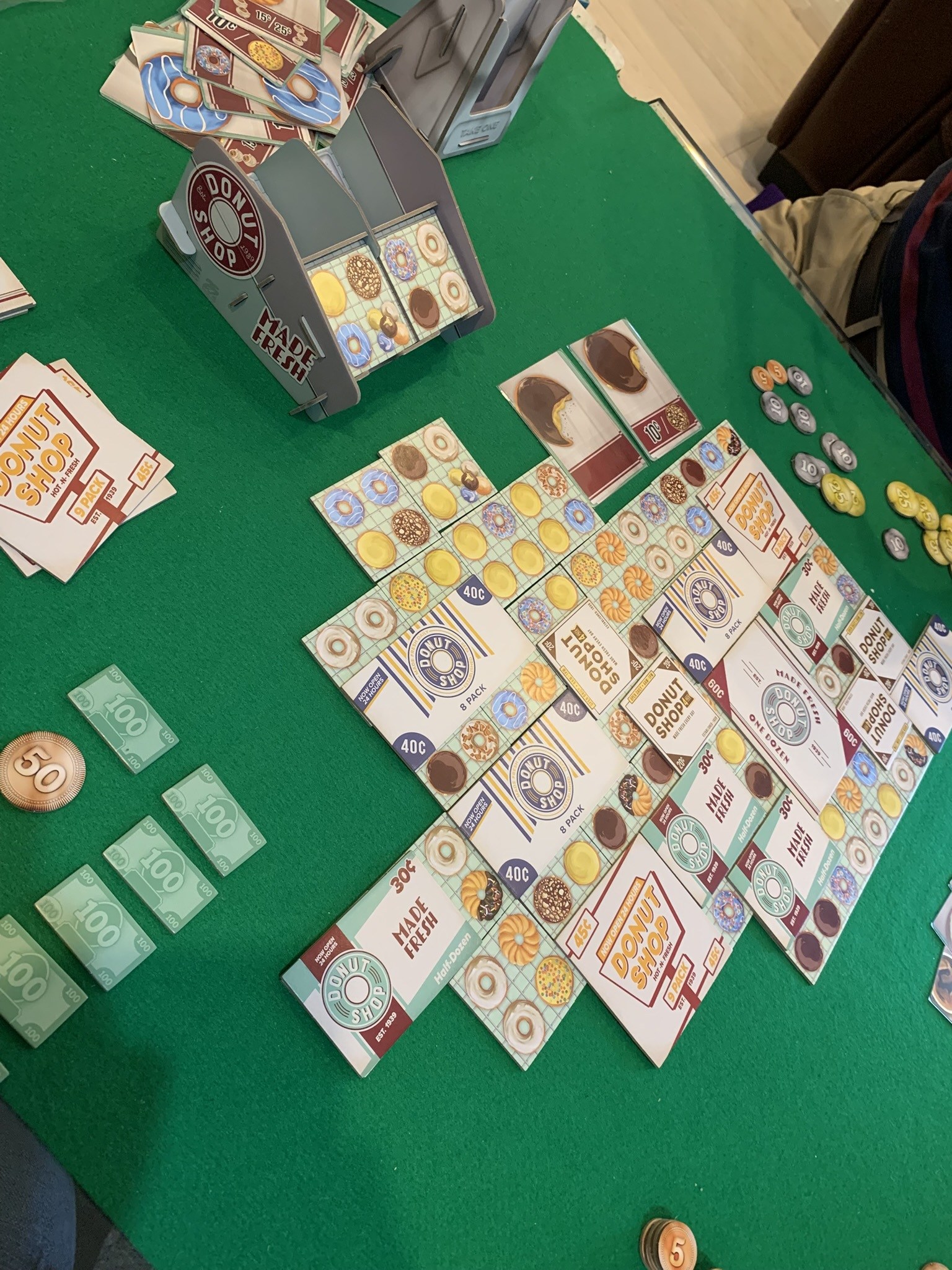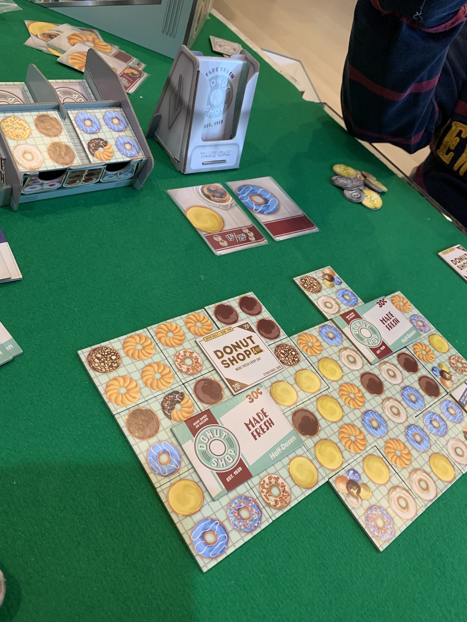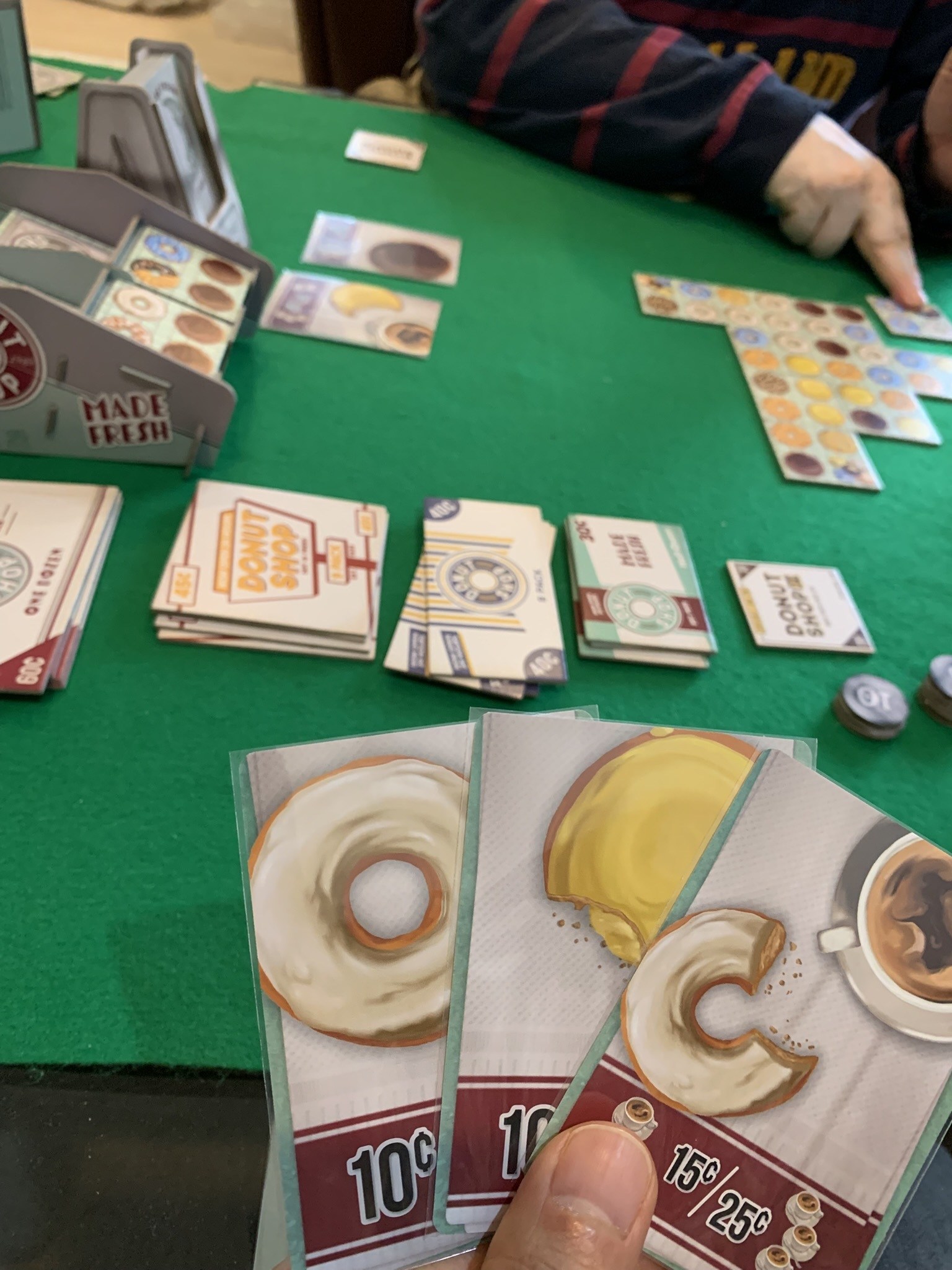 こちらはドーナツを並べて箱詰めして得点化します。ドーナツを並べる場所が全プレイヤー共通なところが推しポイントですね。箱詰めできるタイミングをお互い睨みつつベストなタイミングで得点化しようとします。大きい箱に詰めれば高得点なのですが、ドーナツが並ぶのを待っていると先に他のプレイヤーにドーナツを取られてしまったりとインタラクションが強烈に味わえますね(笑)