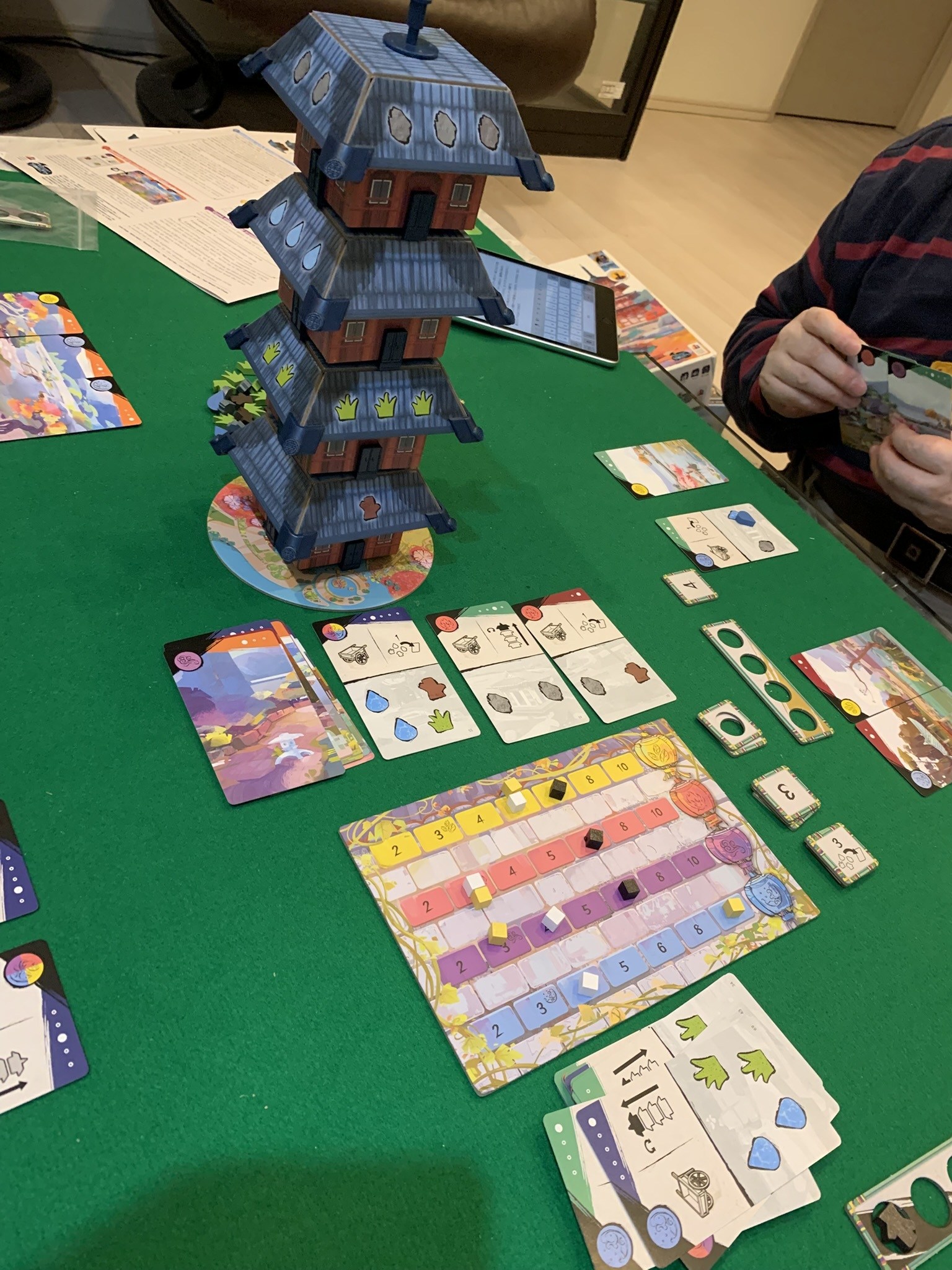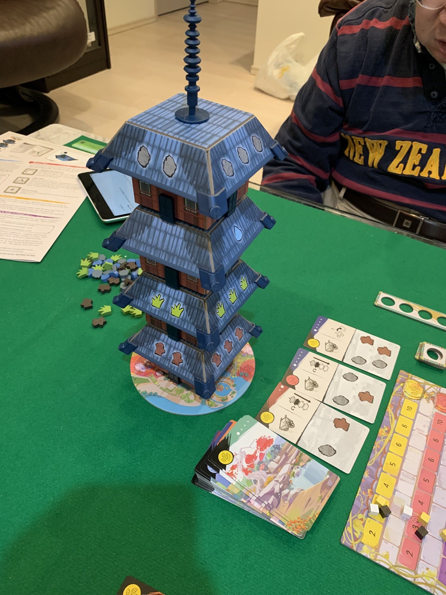 こちらはリソースを獲得する塔が推しポイント。カードを出して塔を回転させて指示通りにリソースを獲得していきます。下段の塔を回すと上に載っている塔も一緒に回ってしまうので、思いがけずもらえるつもりだったリソースがもらえなくなったり、逆に多くもらえたりするところがキモですね。勝者は先生、お見事でした。先生のレビューもどうぞ。
