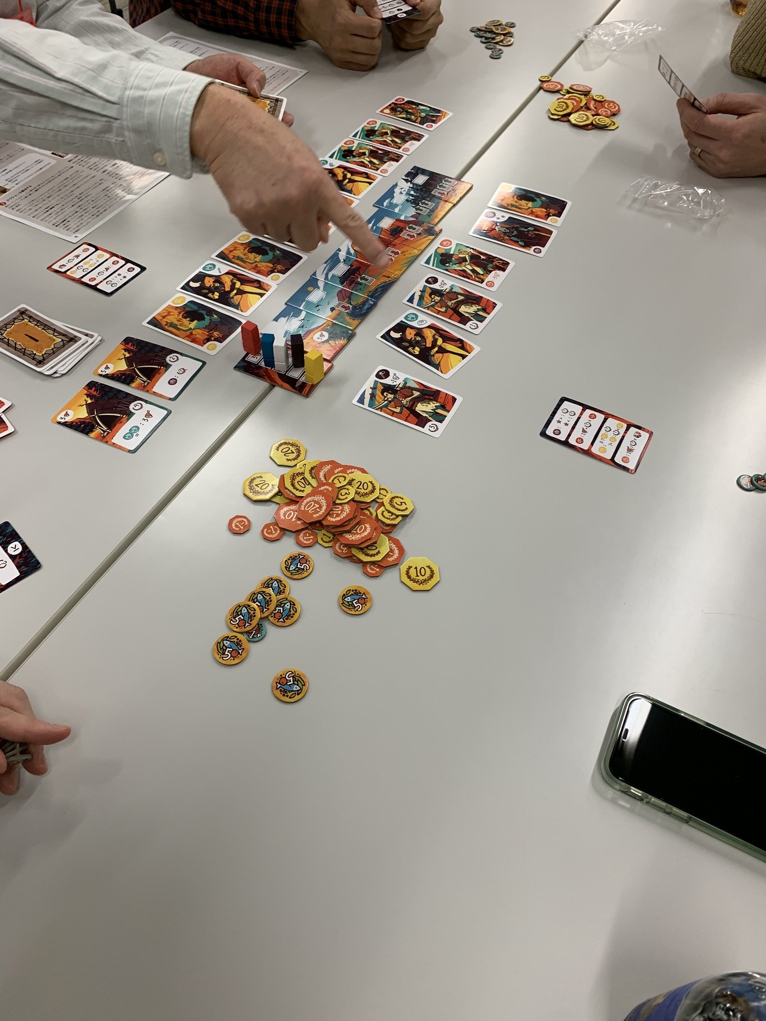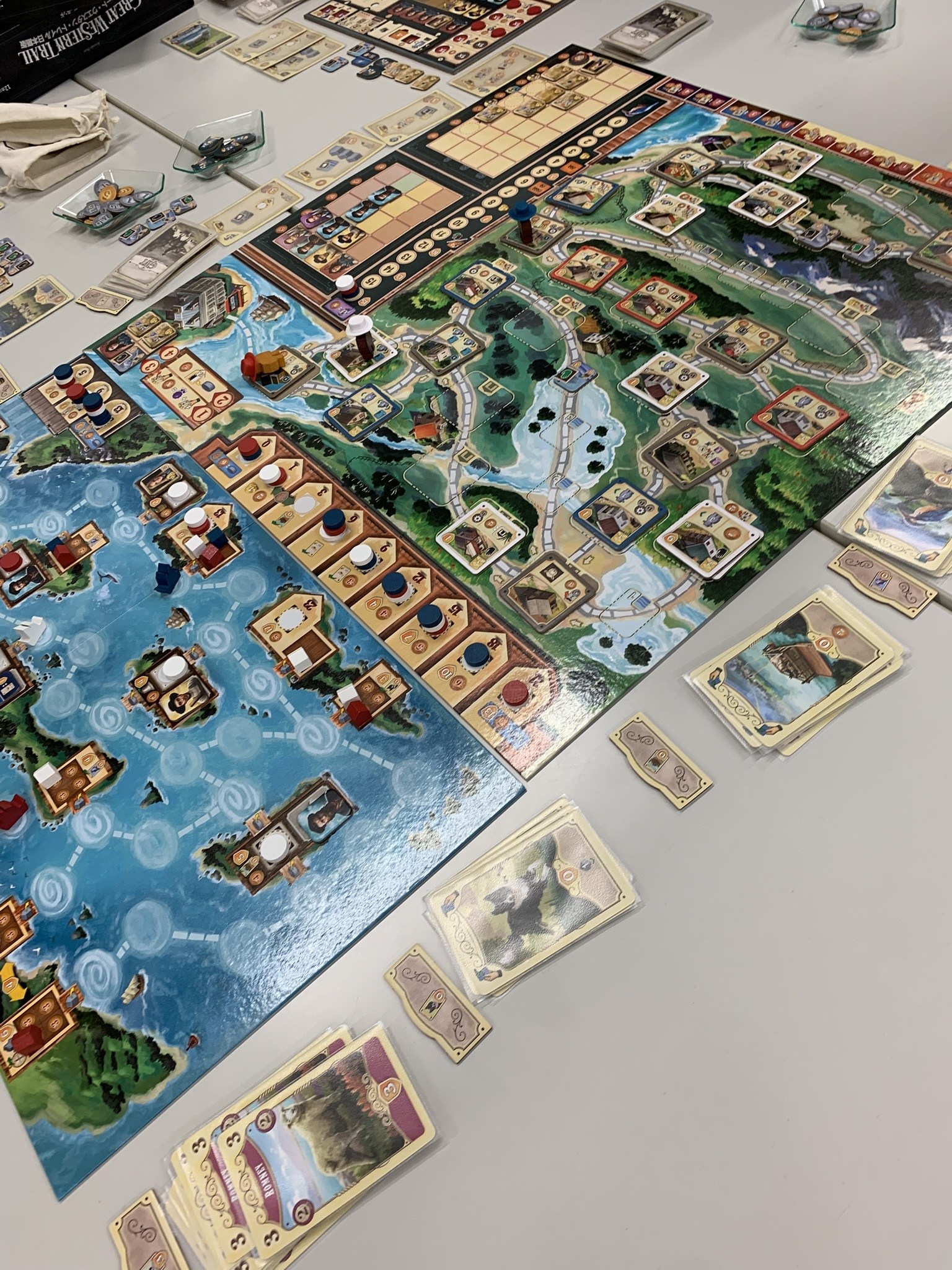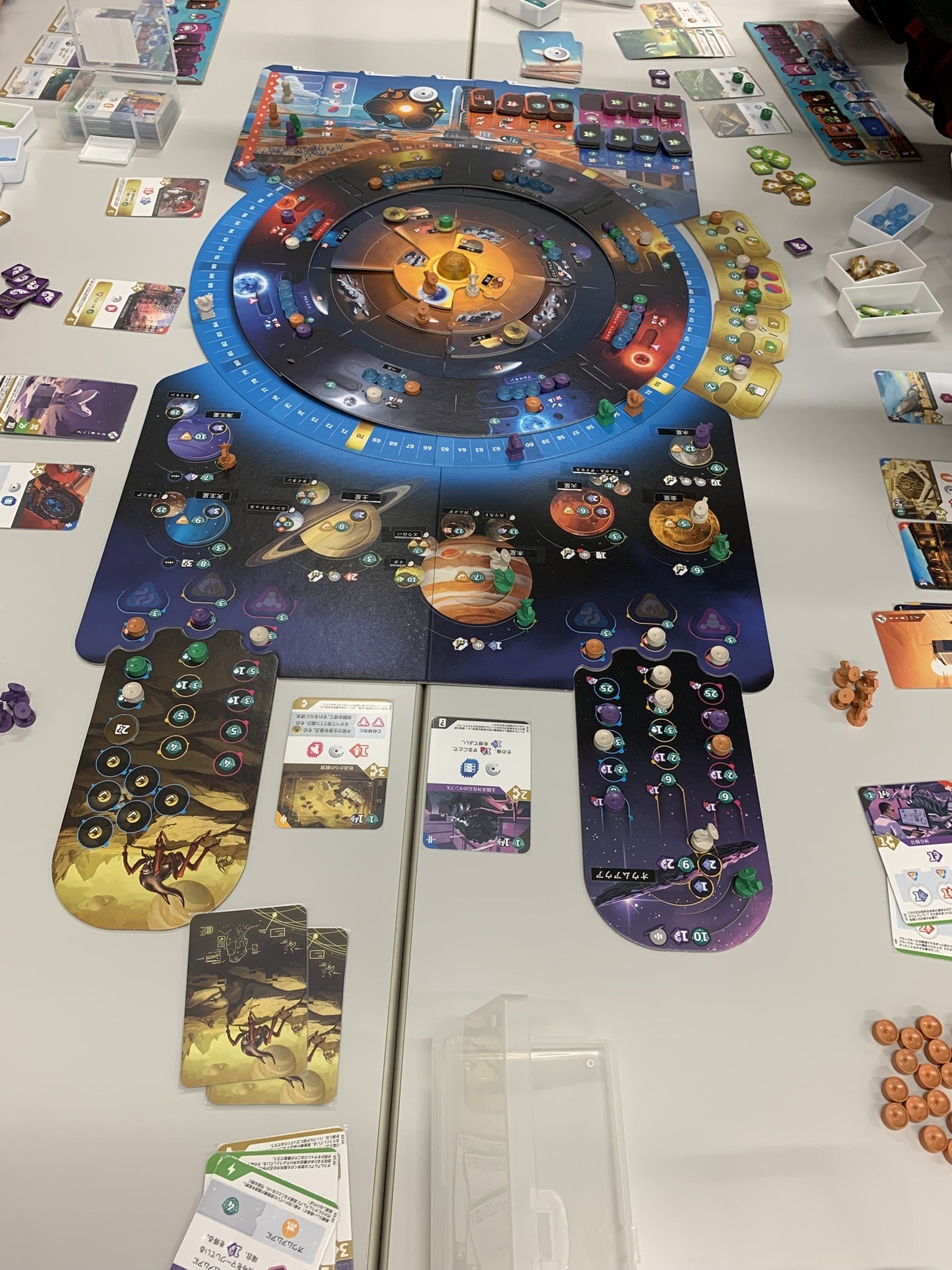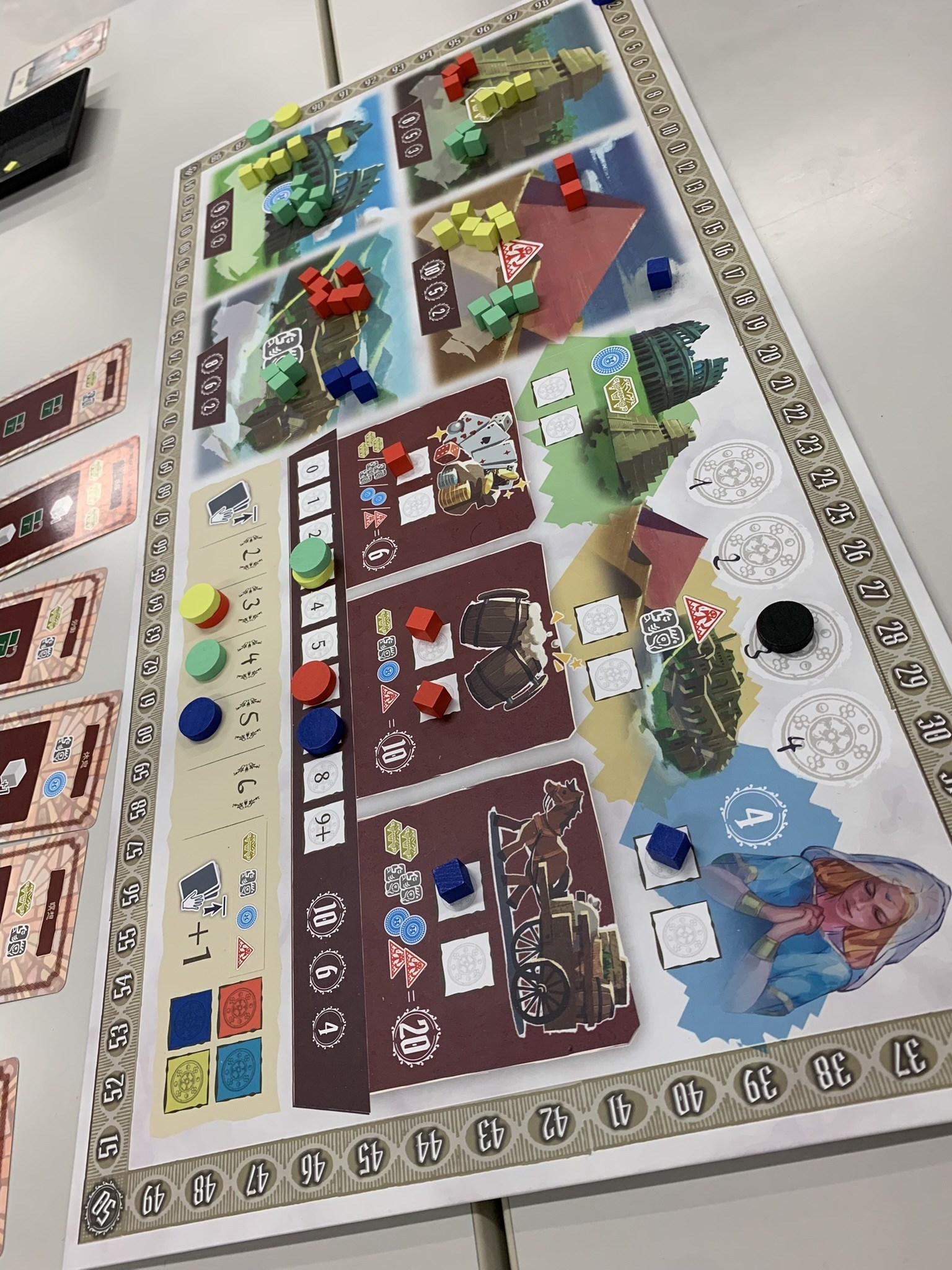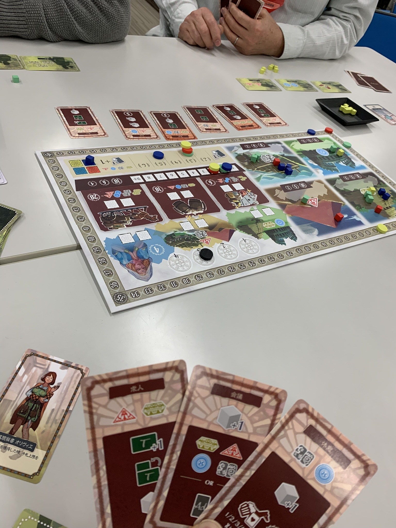 マルシェ・ド・フランス(Marché de France (2018))のリテールリメイク版とのことでしたがまったく前作の記憶が抜けていたのでまっさらな気持ちで遊べました(笑) 過去日記を漁って盤面を見るにアートワークが全然異なるので新鮮な気持ちで遊べたのだと思います。sato さんがとった大概な能力(このゲームでは全部大概なのです)は単に得点がかさ上げされるというもの。進行中にゲームを有利に進められるような基本ルールブレイカーではなくて勝利条件にまっすぐな得点に走って、sato さん曰く「初プレイだし難しい能力を取っても上手く使いこなせる自信がない」とのことでした、さもありなん。私は割とテクニカルな能力を選択したのですが最初のラウンドで足踏みしてしまったのが痛かったな。いろいろな能力のカードがあるので何度も遊んでみたいです。
