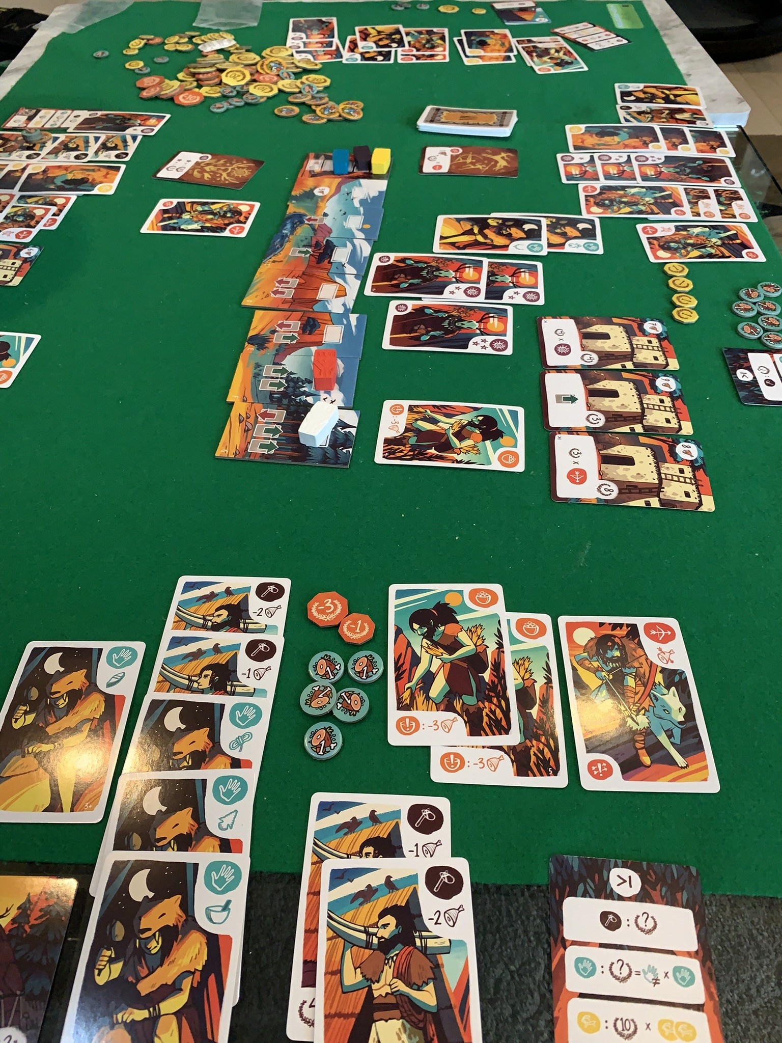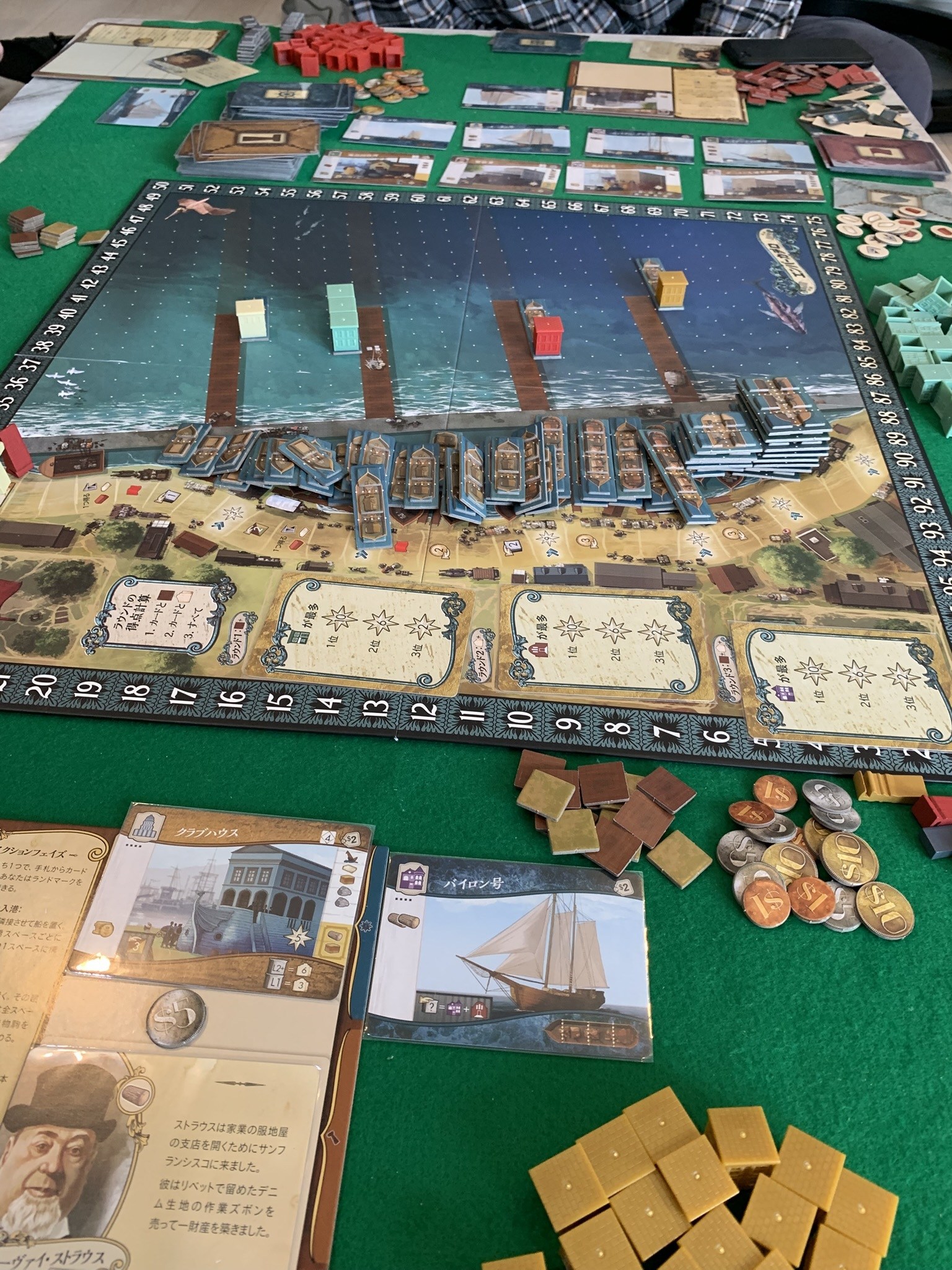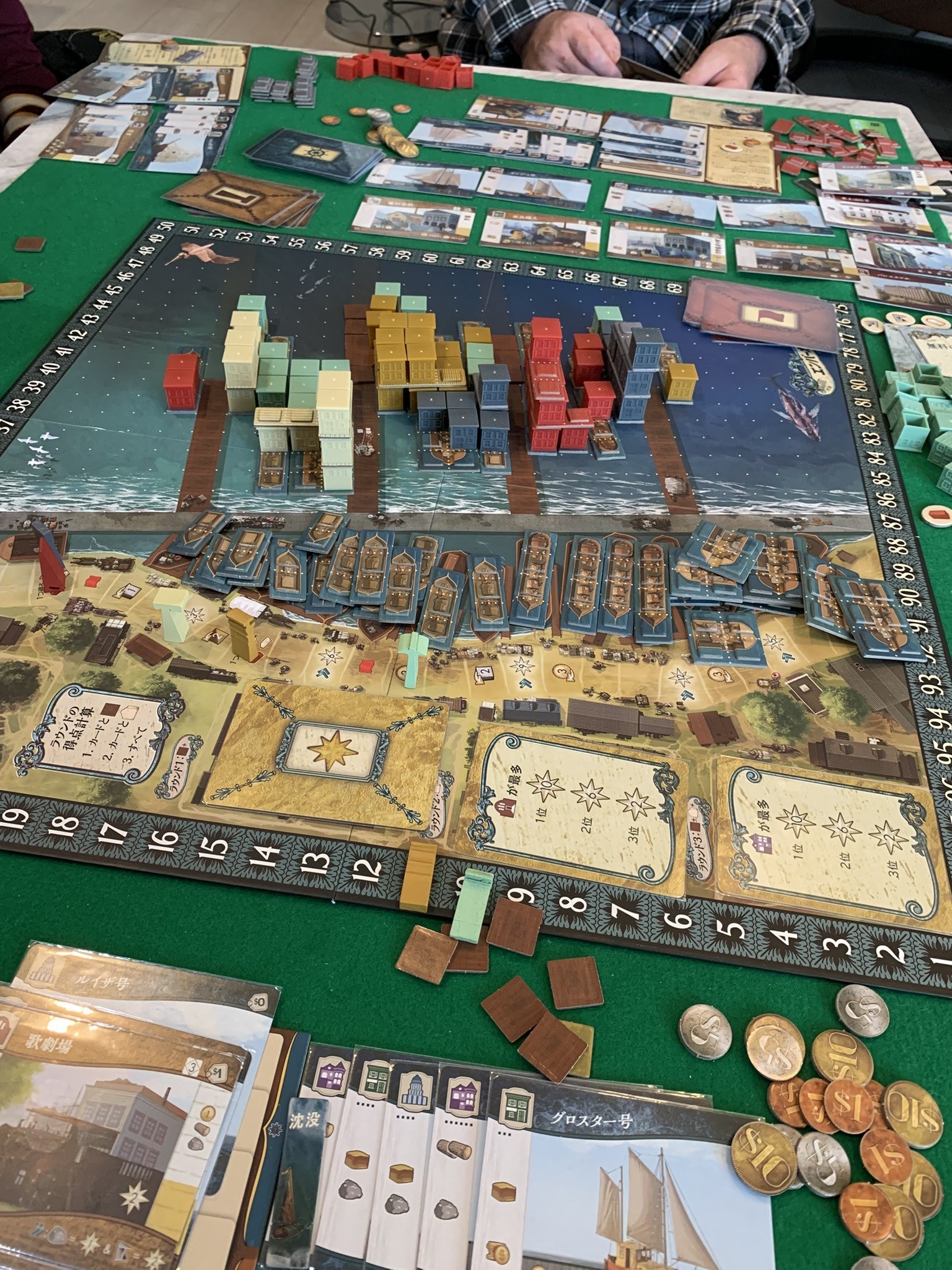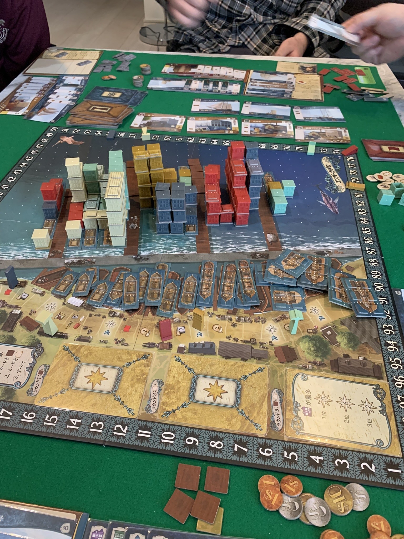オープンドラフトでカードを取って拡大再生産?していきます。今流行りの言葉で言うとタブロービルド。カードを取るときのコストが無しなのでプレイ感がとても軽く、カードの取捨選択と順番のみに注力できるのでサクサク進みますね。勝者はワーカーマンさん、お見事でした。