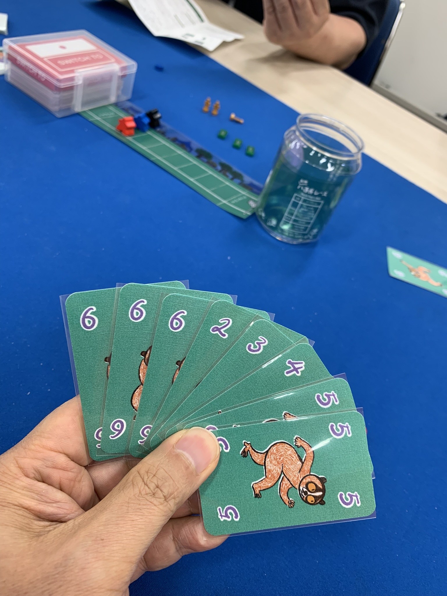 大富豪のようなより強い役を出していきながらレースをするというゲーム。1枚ある特殊カード「怪しいドリンク」を誰かがゴールするまでに使わなければ脱落してしまうというルールもなかなか良い味を出しています。勝者は神楽さん、お見事でした。