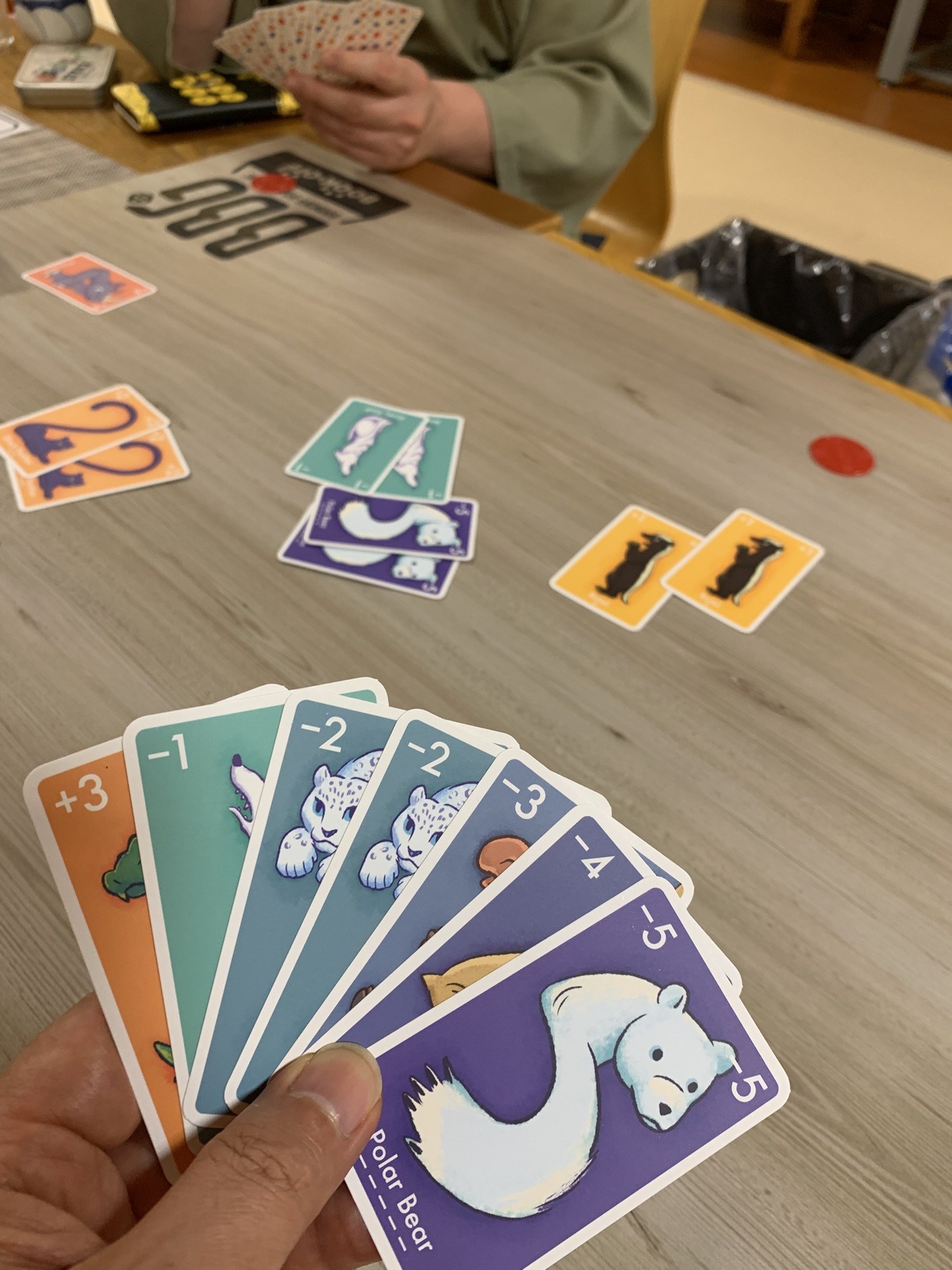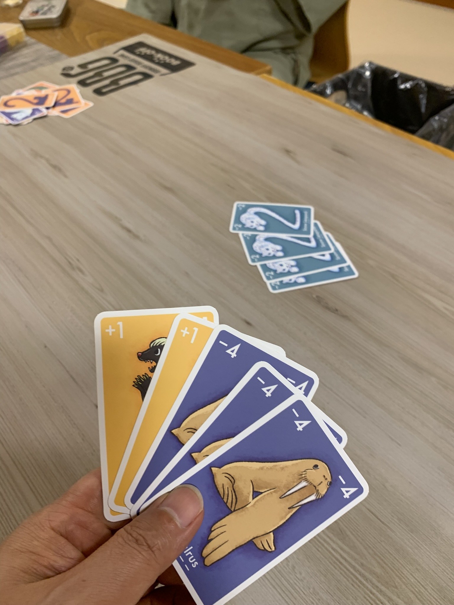 すでに時間は深夜1時近く、もう寝ても良い時間ですがあともう1つ遊ぼうということで大富豪フォロワーのゲームを遊びました。カードにプラスとマイナスの数値があり、より数値が大きい方が強いのですが、勝った時のカードの数値分、場のカードをプラスなら引き取る、マイナスなら手札から捨てるという効果があり、なんてことなさそうなこの効果が素晴らしい動きをして全員がびっくりするというアハ体験ができました。このアイデアはほんとに素晴らしいです!