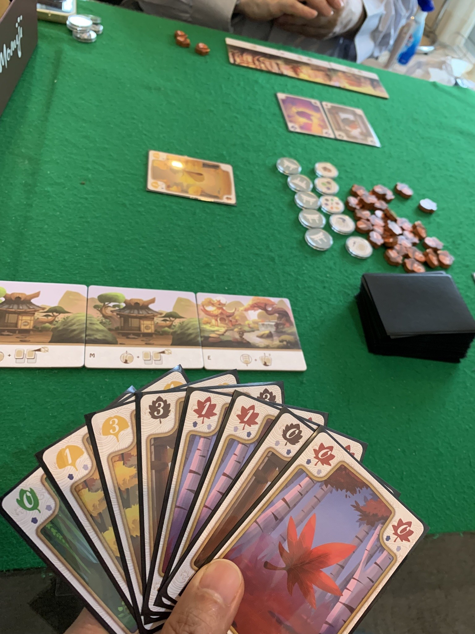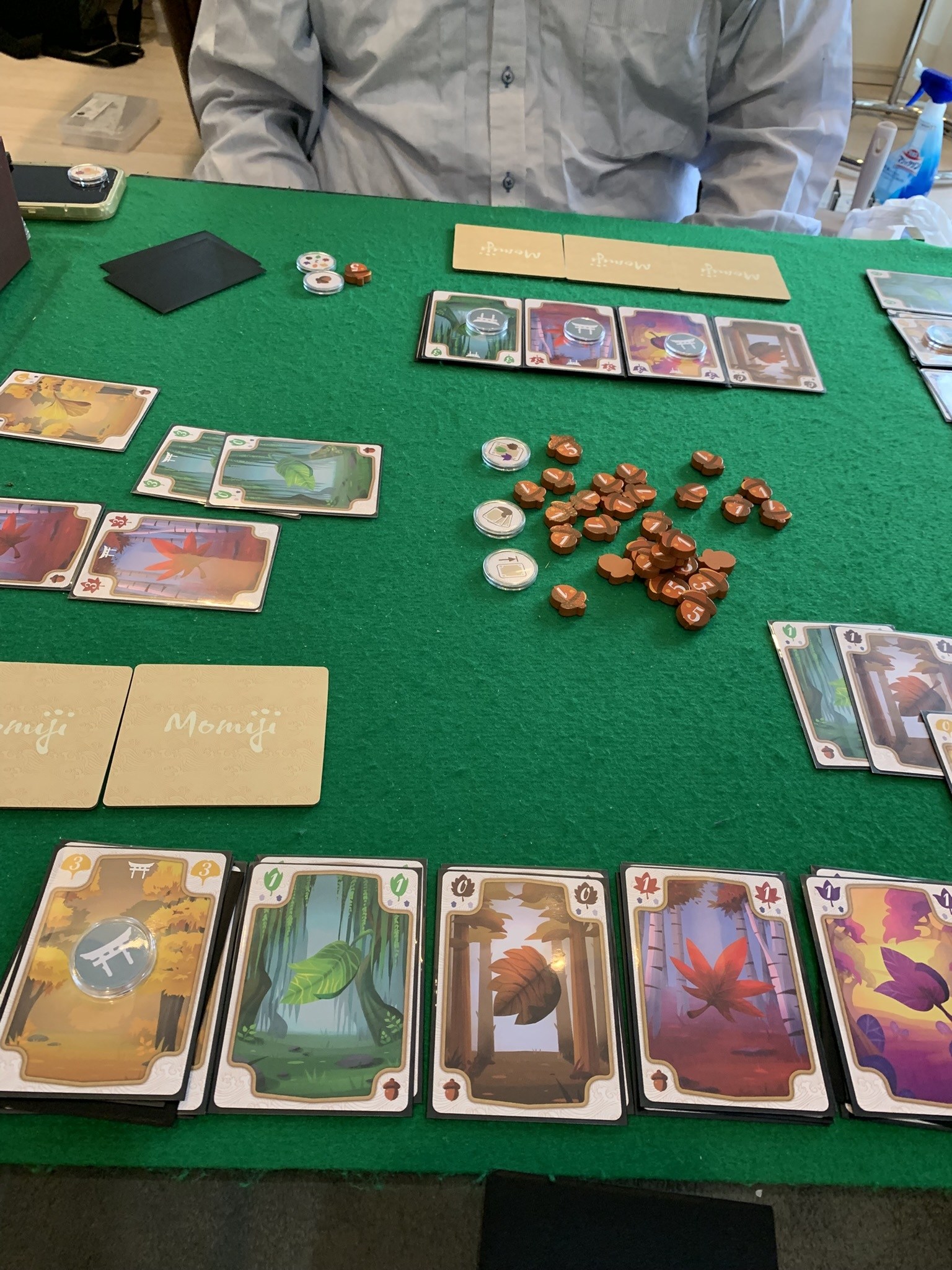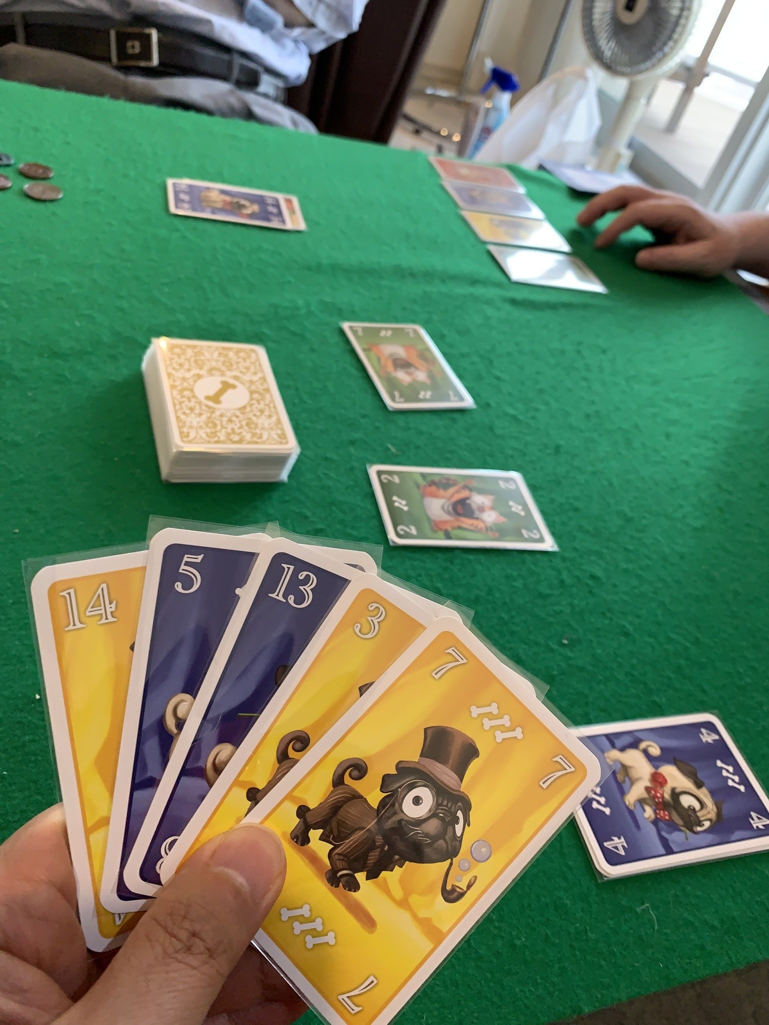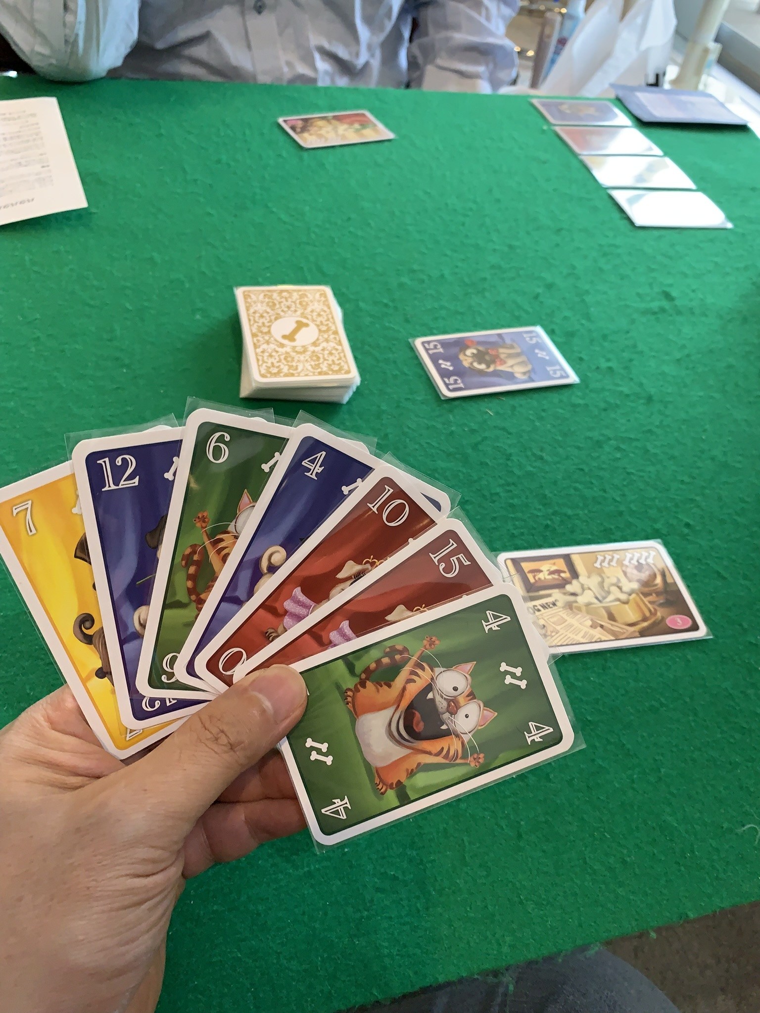 トランプがめまぐるしく変わるトリックテイク。まず1ディール中0トリックだった場合の得点が提示されまして、これが7点(3人プレイの場合)と結構高めに設定されています。通常通りトリックを取る場合にはトリックで勝った時のカードに書いてある骨の数が得点となり、数値が高い(強い)カードほど得点が低くなっています。また基本的にはマストフォローなのですが猫のスートのみワイルド扱いになっていてフォローの義務に従わなくて良いところが完璧に読み切れなくて微妙にコントロールできないところが面白いですね。トランプがめまぐるしく変わるところは「やあ、こんにちは!」を思い出しました。やあ、こんにちは!にミゼールでの得点を追加したフォロワーといったところでしょうか。勝者は政景さん、お見事でした。
