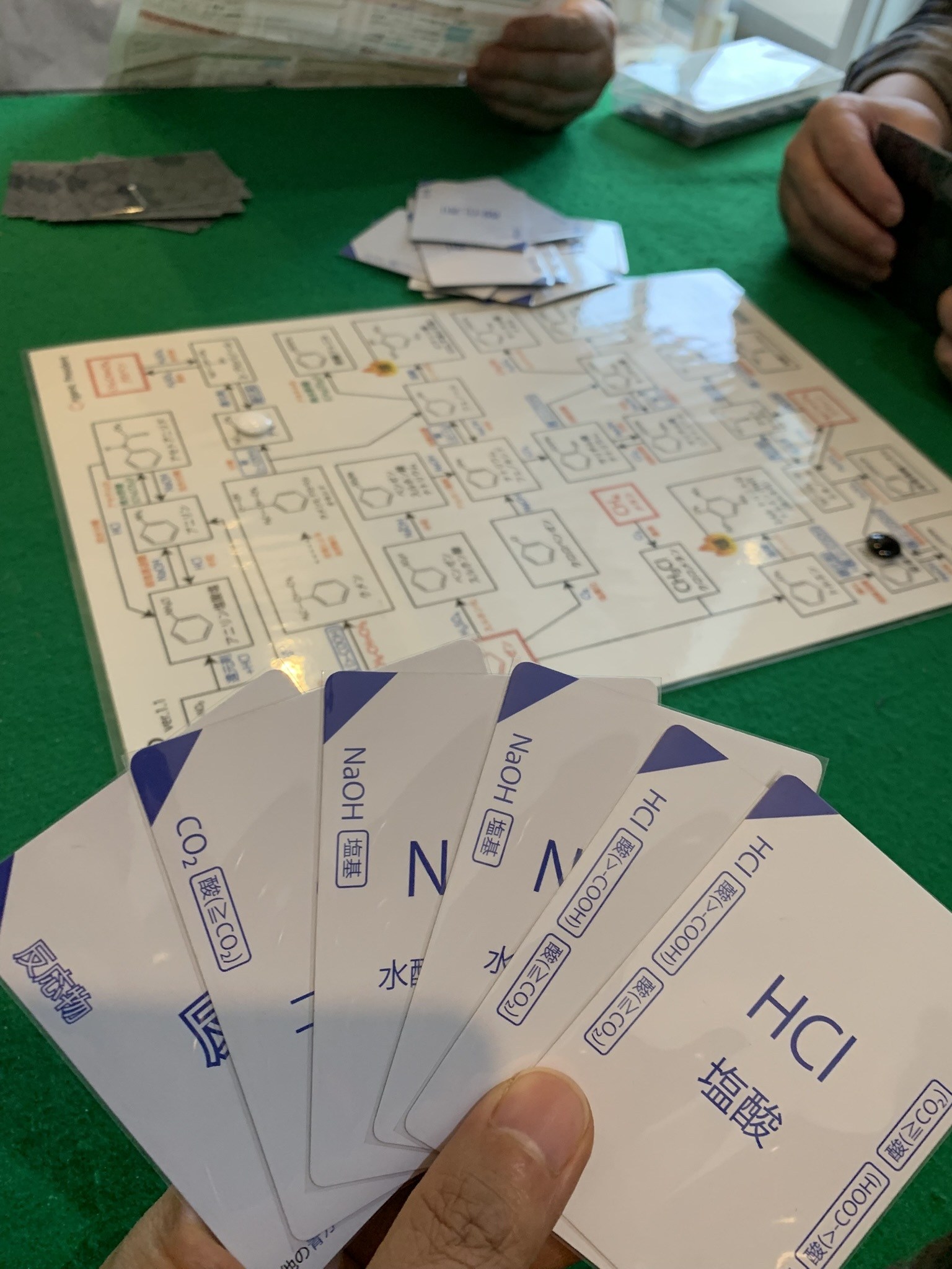 このゲームを開発したのは現役の東大生とのことです。受験勉強の傍ら有機化合物の反応を覚えるために作ったというのだから遊んでいるよりはお勉強している感じがしてあまり楽しめなかったかな。ボードに一覧があるので次にこのカードは出せる、出せないというのは見てわかったのは幸いでした。割とどの状態でも化合できる物質もあって、自然界にもワイルドカードみたいな存在があるものだなぁ、と感心するのでした。先生の素晴らしいレビューもありますのでぜひどうぞ。