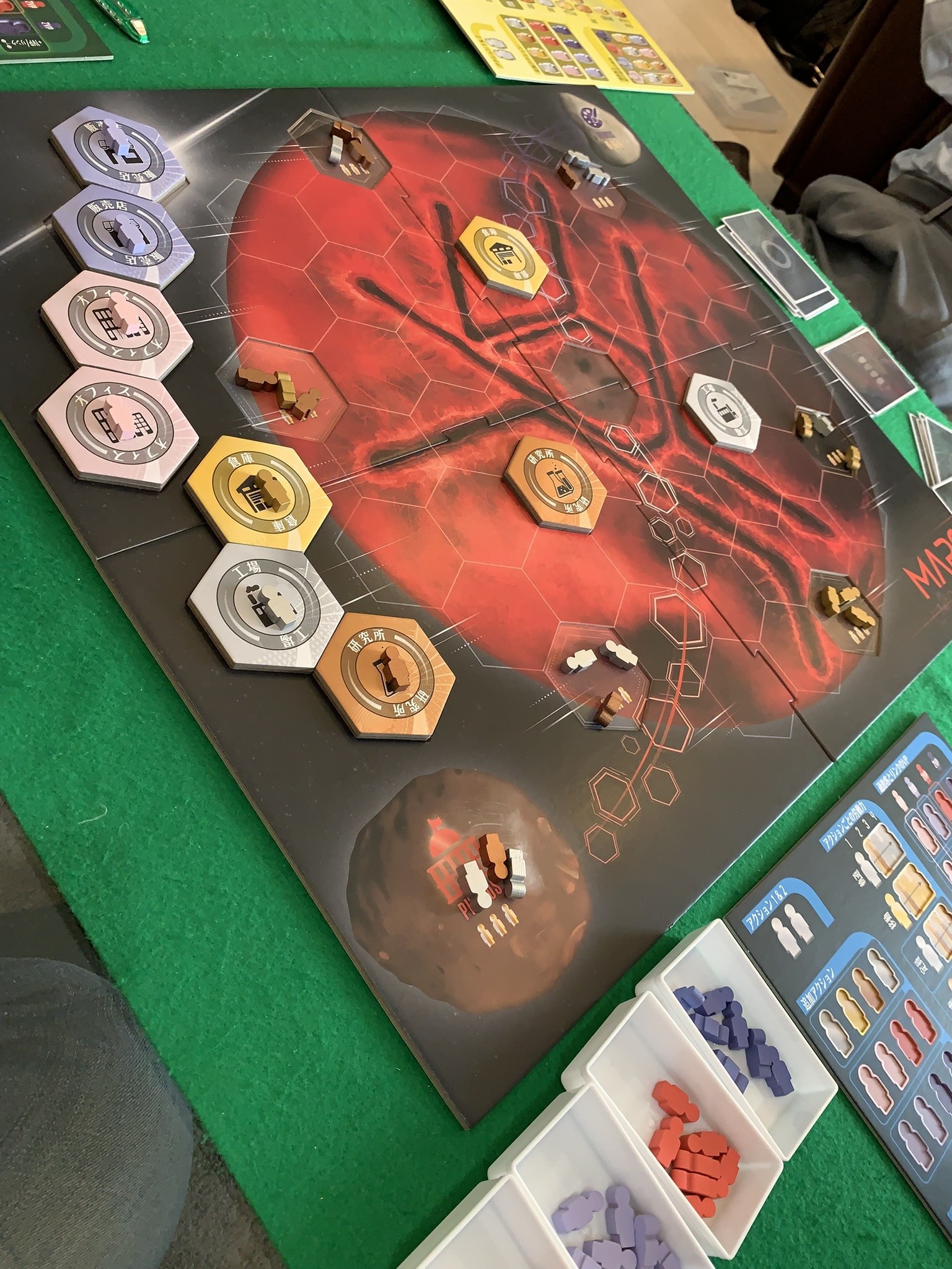 重めの鉄道ゲームです、というとちょっと身構えてしまいますね、初プレイの時は「難しい~、失敗した~」という印象が残っています。今回は拡張の火星マップで遊ぶということで火星つながりで多少の心理的障壁が回避できました(笑) 初回のときよりパラメーターの管理を上手くやりくりできていたとは思うのですが勝敗には絡めずじまいでした。