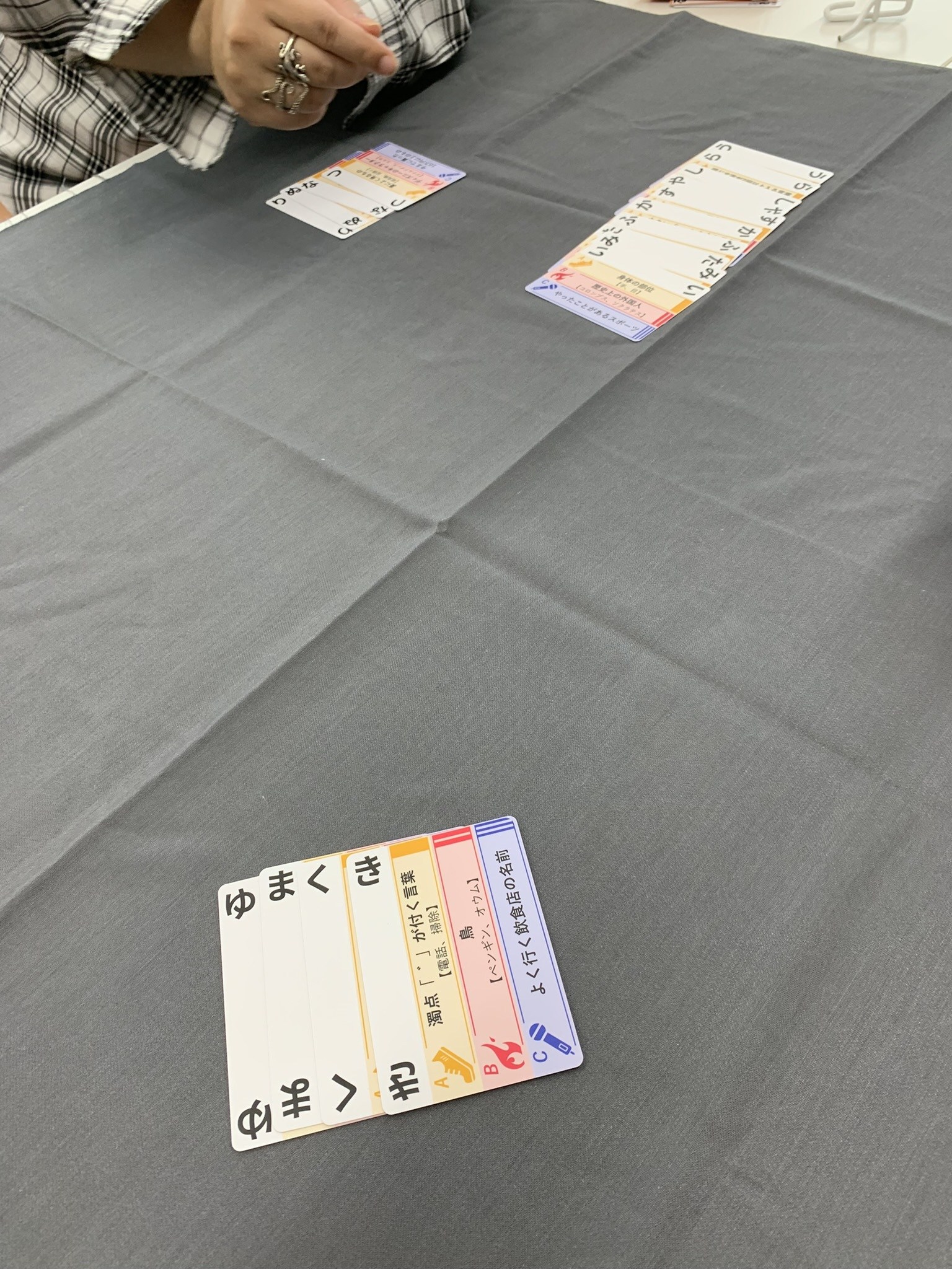 普段ご家族で遊んでいて、お子さんとボキャブラリープールの差がありすぎるのでたまには大人同士で思いっきり遊びたいというアロワナさんファミリーと遊びました。「いろはことば」「ワードスナイパー」のようなワードゲームでした。ワードゲームは一定の楽しさが保証されていますね。