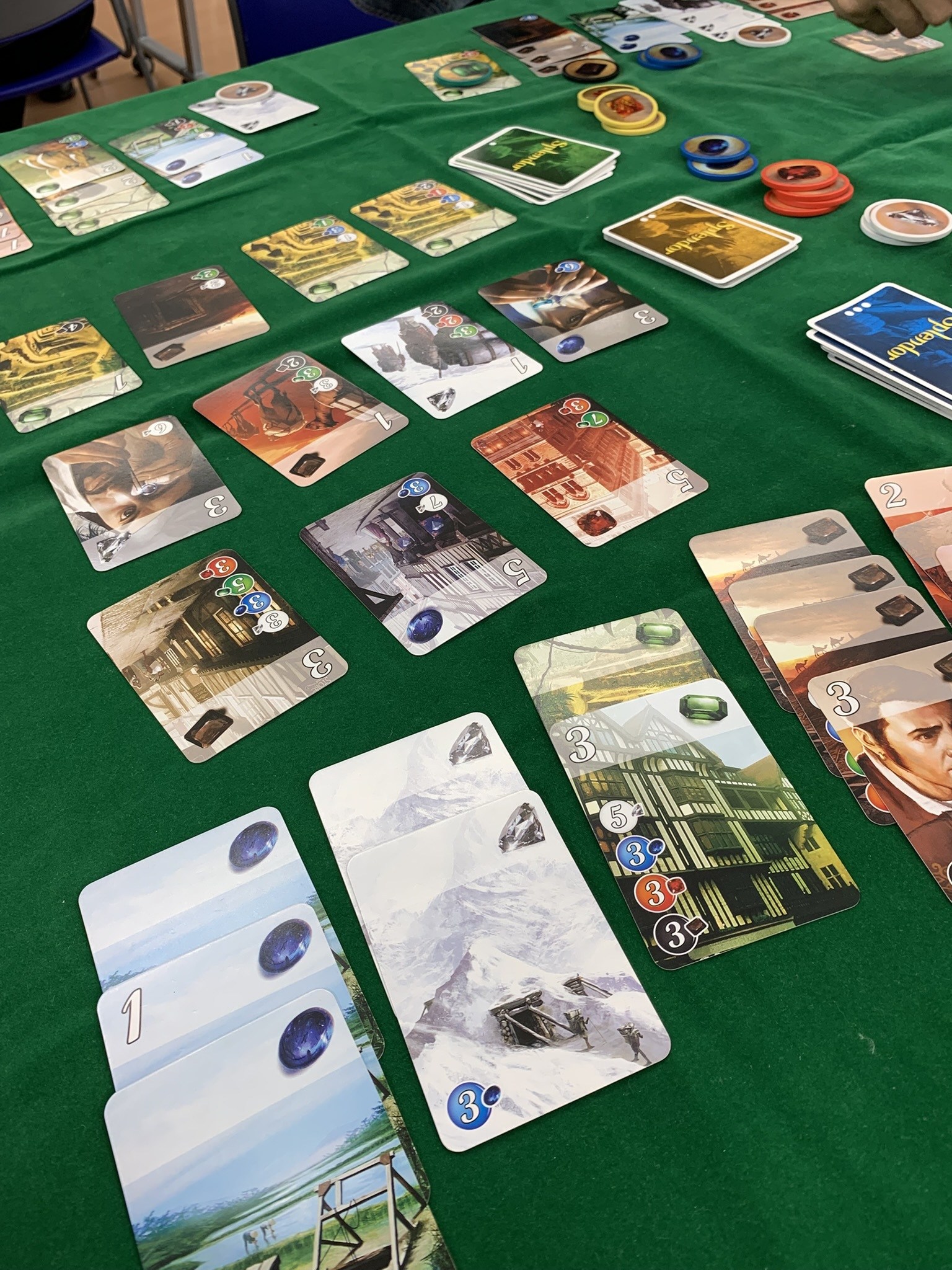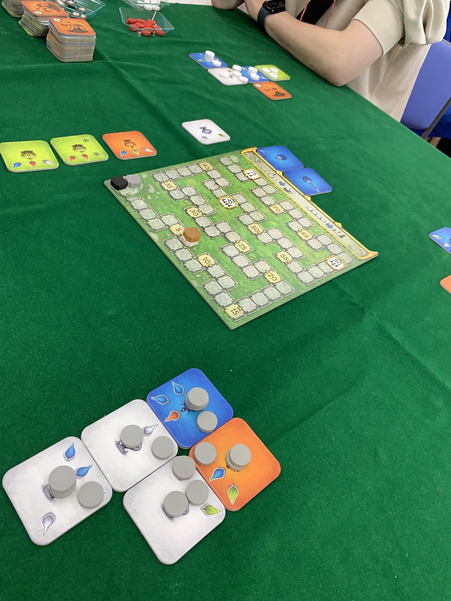 お次はスタッフさんの呼びかけに手を挙げて Uwe Rosenberg 先生のタイル配置ゲームを遊ばせていただきました。一口にタイル配置と言ってもいろいろありますね。これはタイル自体にお題とお題達成のためのリソースが一緒になっているパズル要素濃いめなタイプです。勝者はまむさん、お見事でした。