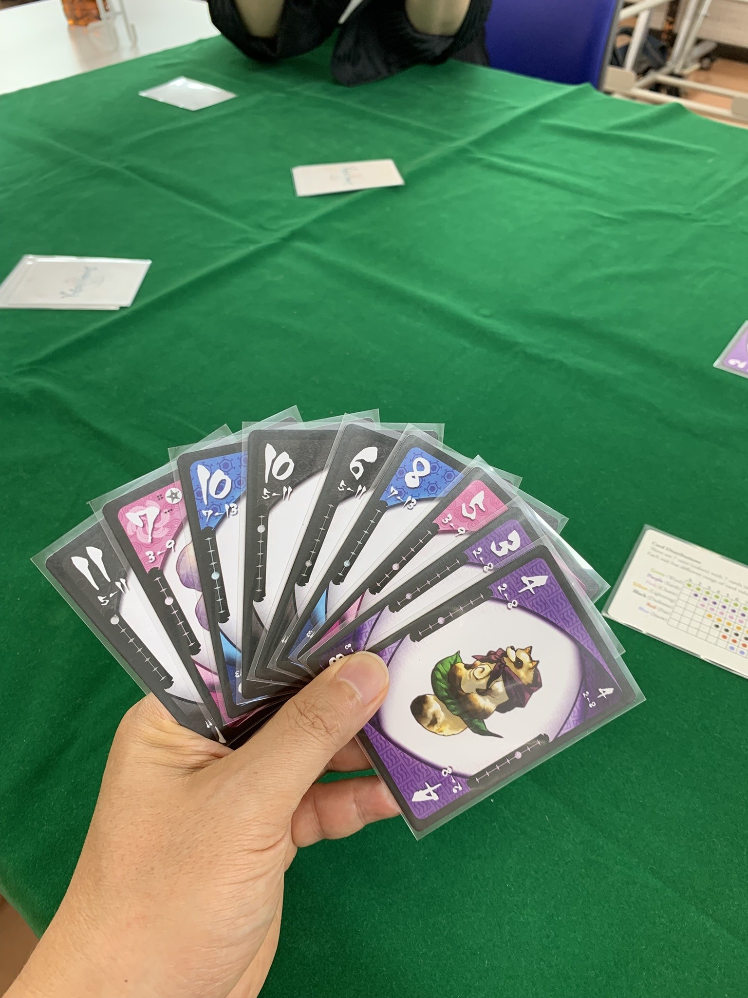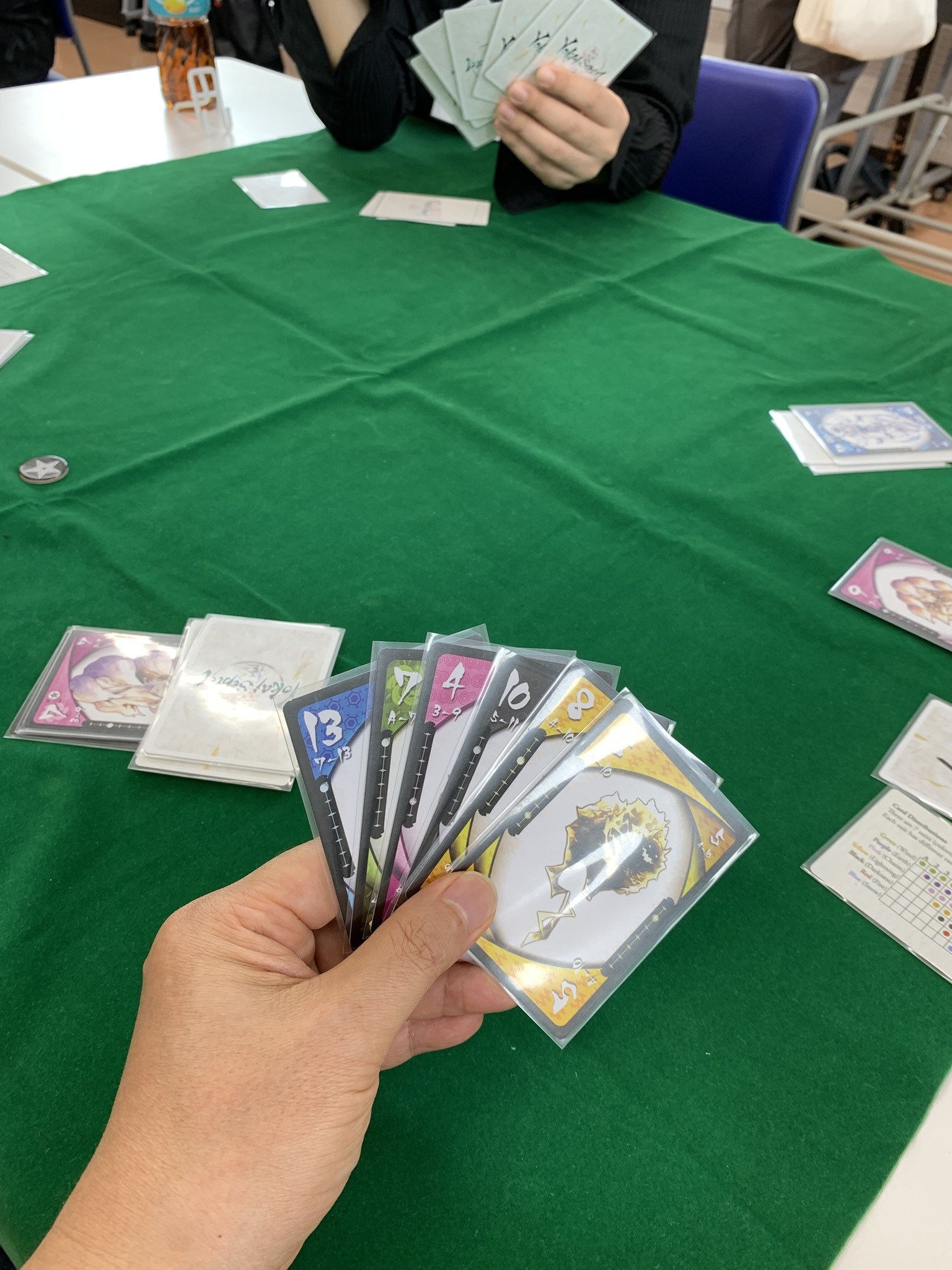 「七つの紋章、七つの部族」「セブン」でおなじみの(?)ちょっと変わったトリックテイクの海外リメイク版を遊びました。箱絵もカードデザインもとても素晴らしい形でアップデートされています。今回は私とぽんさんがトリックテイク経験者ぽかったのであえて別チームに分かれましょうと提案したのが良かったと思います。トリックテイク初心者にこの手の変形スタイルは面白さを見出す前に難しく感じてしまうのではないかなと懸念してしまうのですが、楽しんでいただけたかなぁ。勝者はぽんさんとばりんさんペア、お見事でした。
