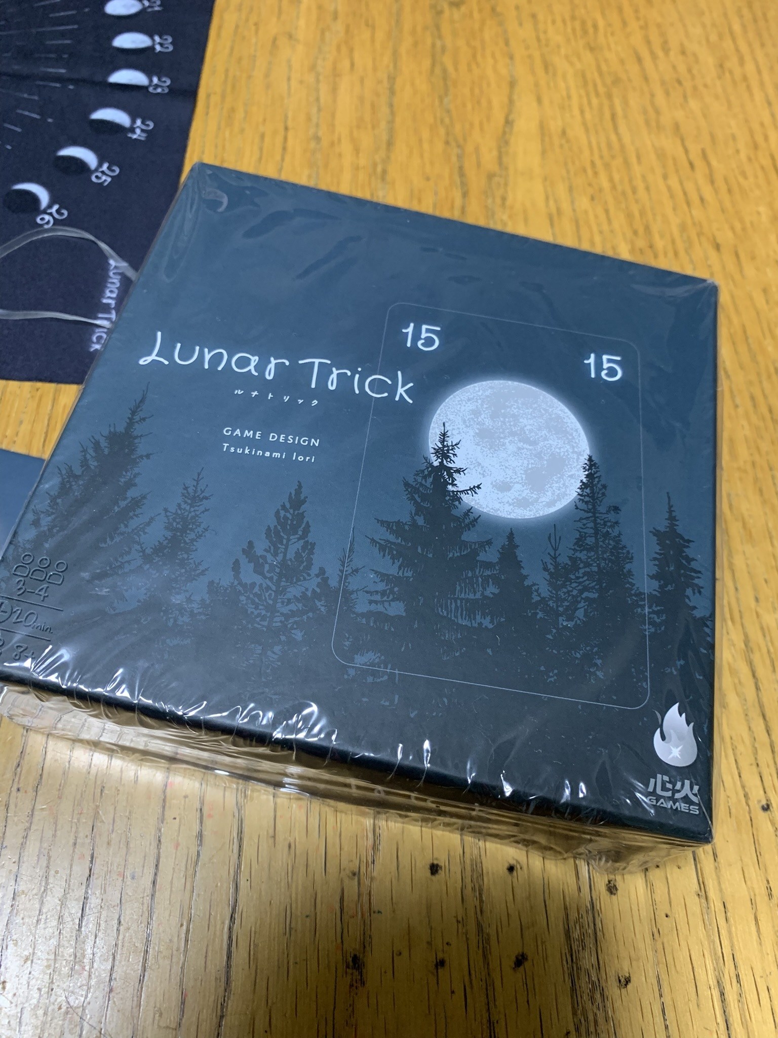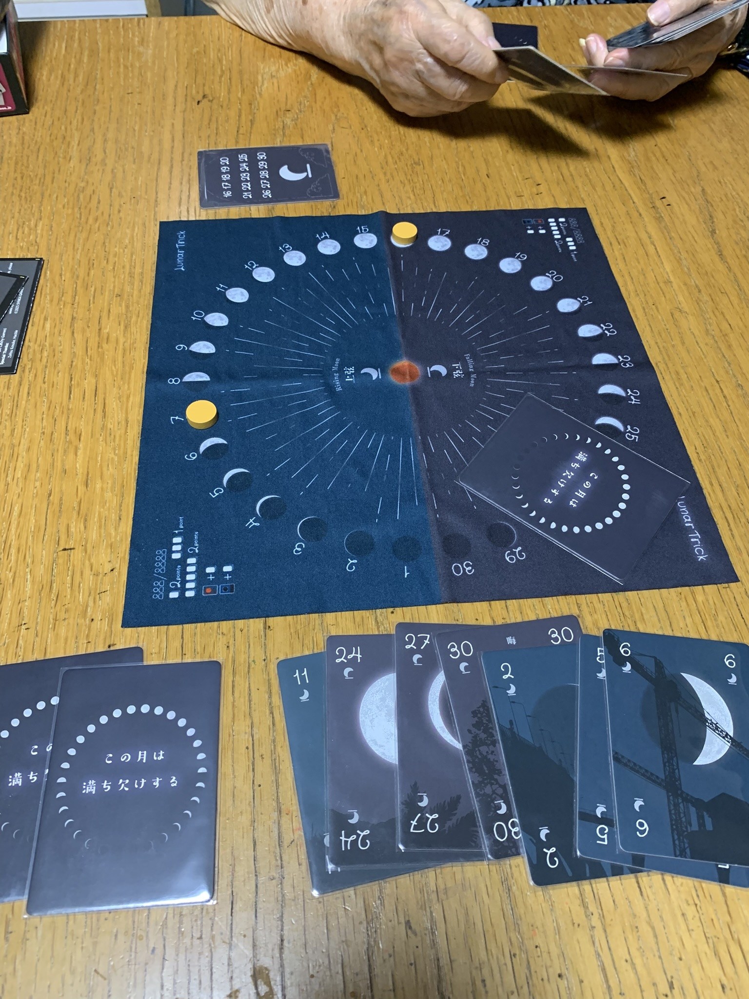 ゲームマーケット2025春に初お目見えのトリックテイク。カード自体には数字しか描かれてなくて、中央にある月ボードの仕切りの状況によってスートやトランプが決まるというもの。ママさんがスートの概念を理解できなかったため協議終了となりました。