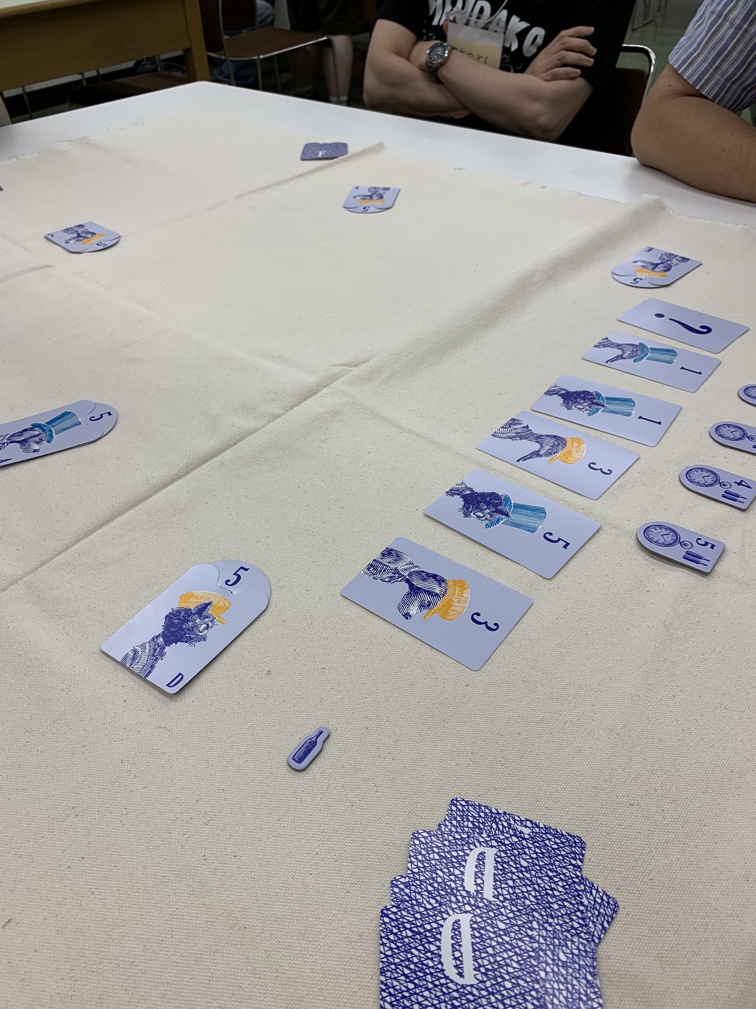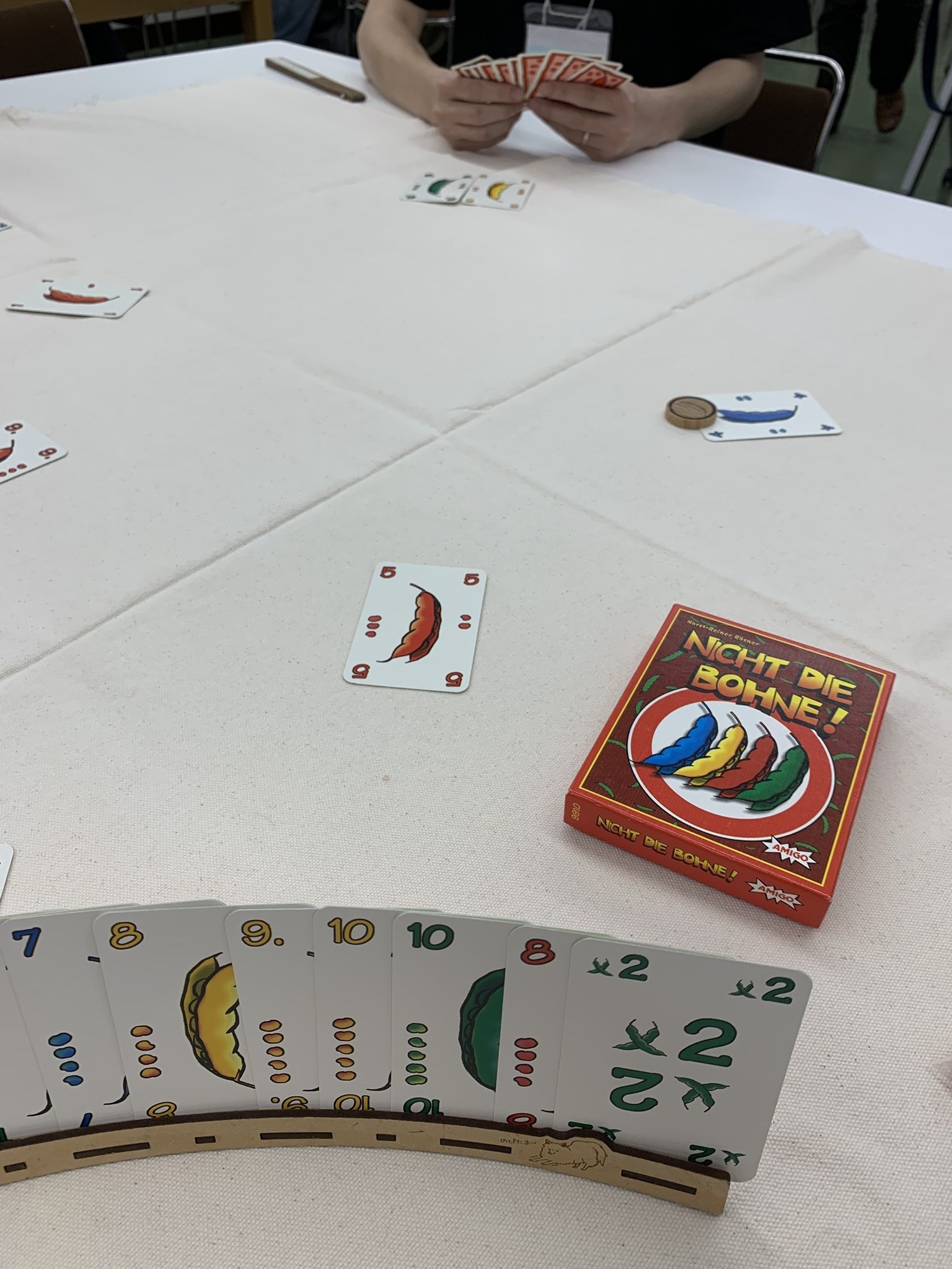 こちらはトリックテイクではありませんがカードの取り方がトリッキーです。自分に配られたカードは一切自分で取れないところがユニークですね。ちょっといやらしいゲームなので初対面同士が多いメンバーで出すゲームではありませんでした。反省。勝者はボドのんさん、お見事でした。