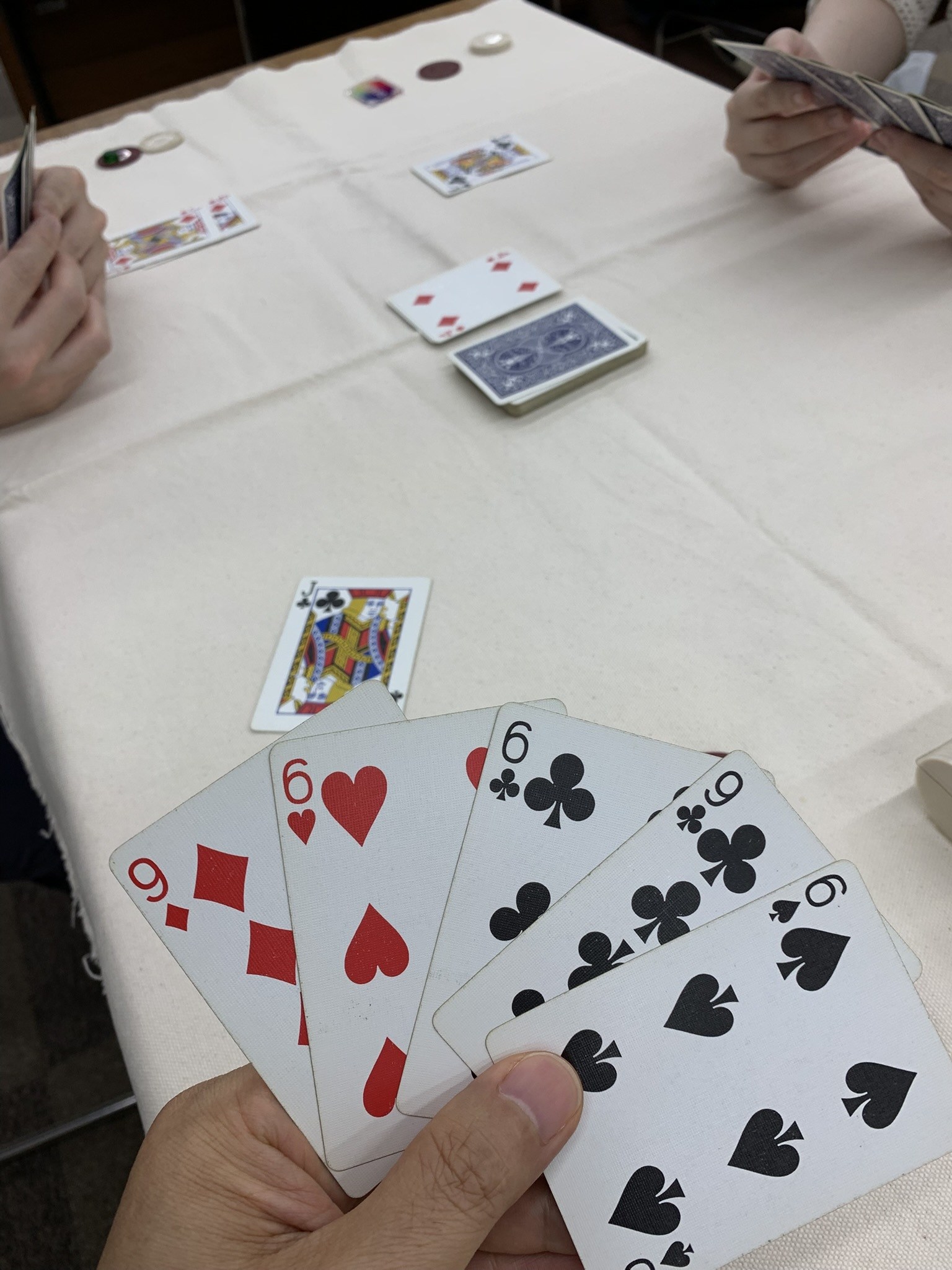 お次は Reiner Knizia 先生作の1人1組のトランプを使ってポーカーの役を作るゲーム。こちらもお手軽に遊べるゲームです。チップを袋から出すときのくじ引き感とトランプのデッキから「〇〇のカード来い!」とカードをめくる期待感が先のゲーム同様に楽しい要素になっていると思います。こちらも勝者はすづきさん、お見事でした。