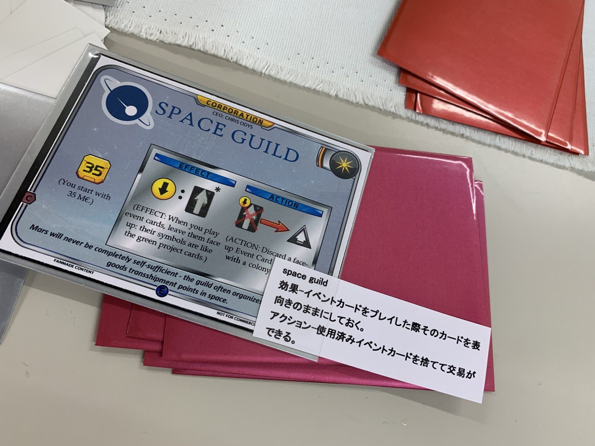 今日の企業その3「SPACE GUILD」。イベントカードを使った後も表面にしておくという意味はタグが使えるという利点があることなのだけど、エピック環境ではデフォルトでどんなカードのタグもカウントされるので弱い印象になってしまいます。使い切ったカードが交易のリソースに使えるのは好きですね。初期MCが少なすぎるのが残念。宇宙タグが付いているのは序盤にインフラカードが取れる条件なので加点要素です(笑)