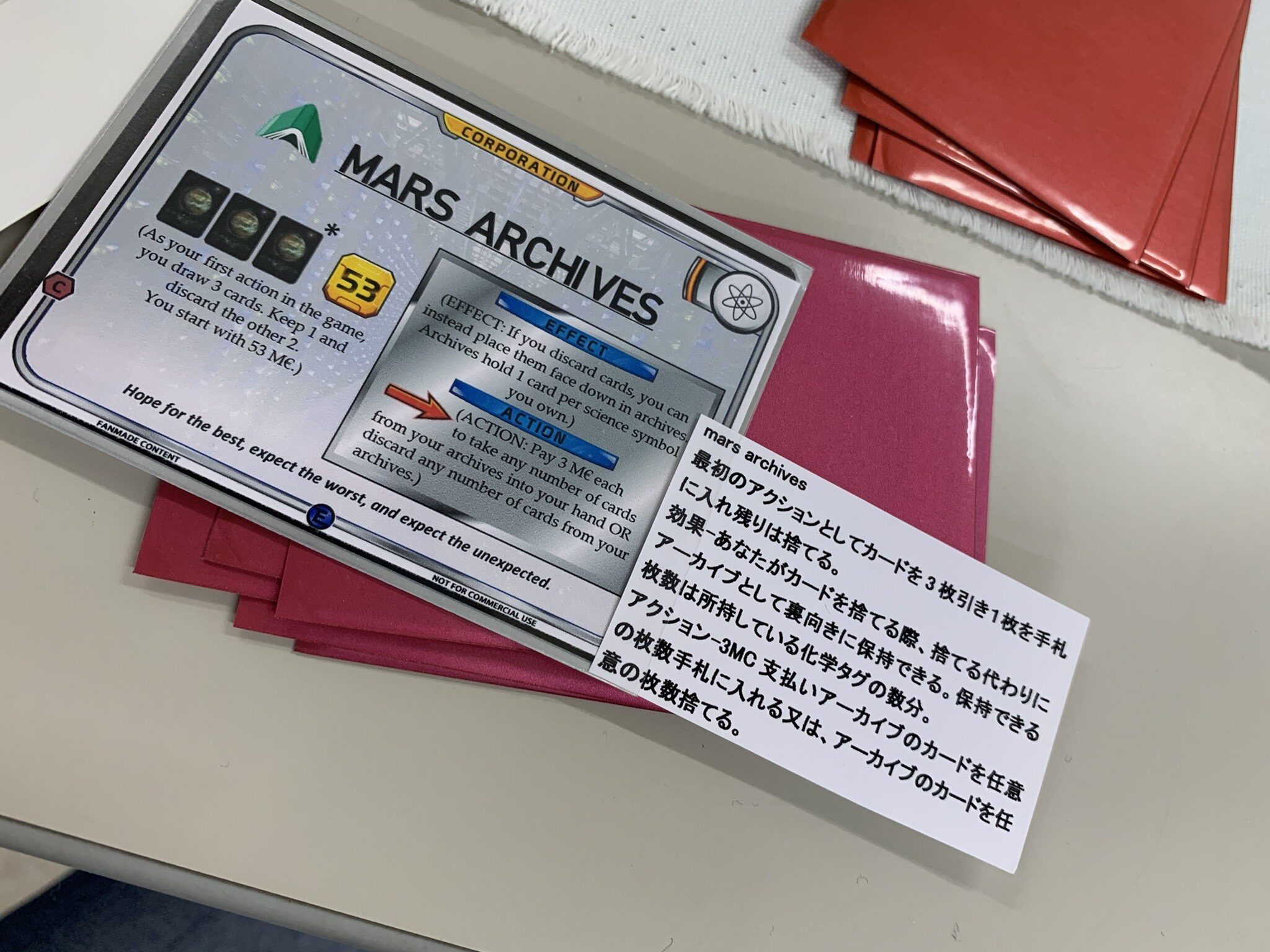 今日の企業その4「MARS ARCHIVES」。今すぐ使えないけどゲームの後半に使いたいカードなどを保持できる効果は面白いですね。TCGでよくあるハンデスの効果を回避できるという点では良いのだけど「テラフォーミング・マーズ」においてはほとんど手札のカードを捨てされられることはないので爆アドという印象ではありませんね。初期53MCは素直に嬉しい。