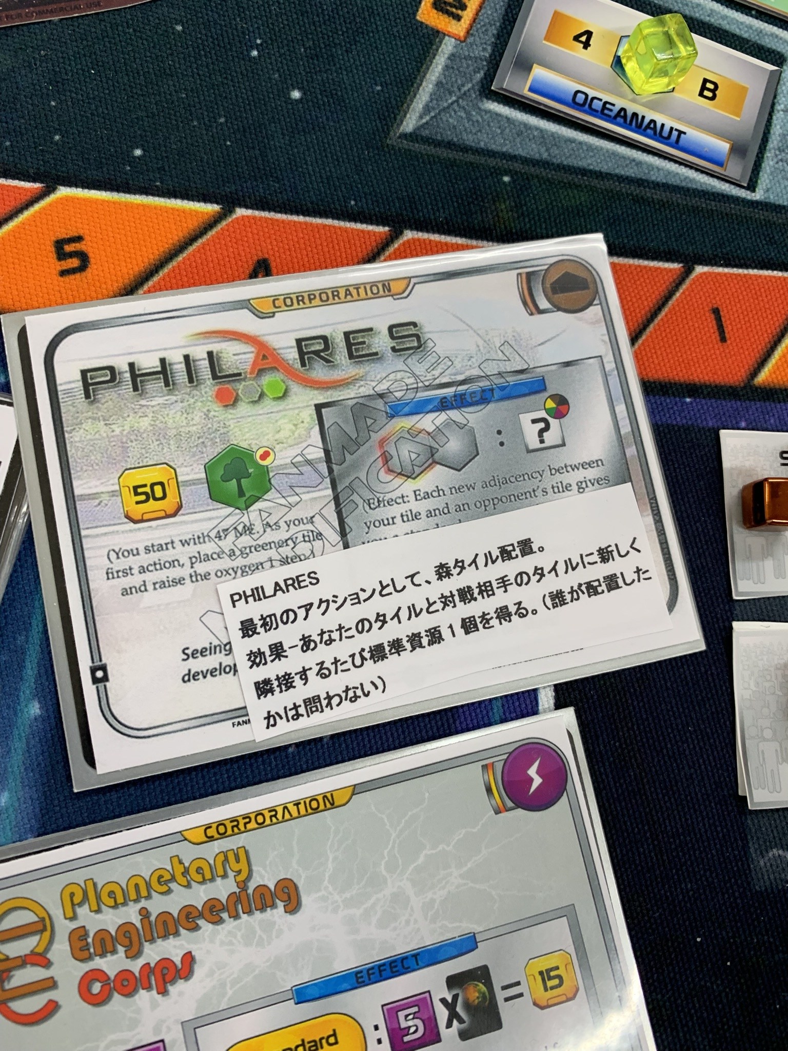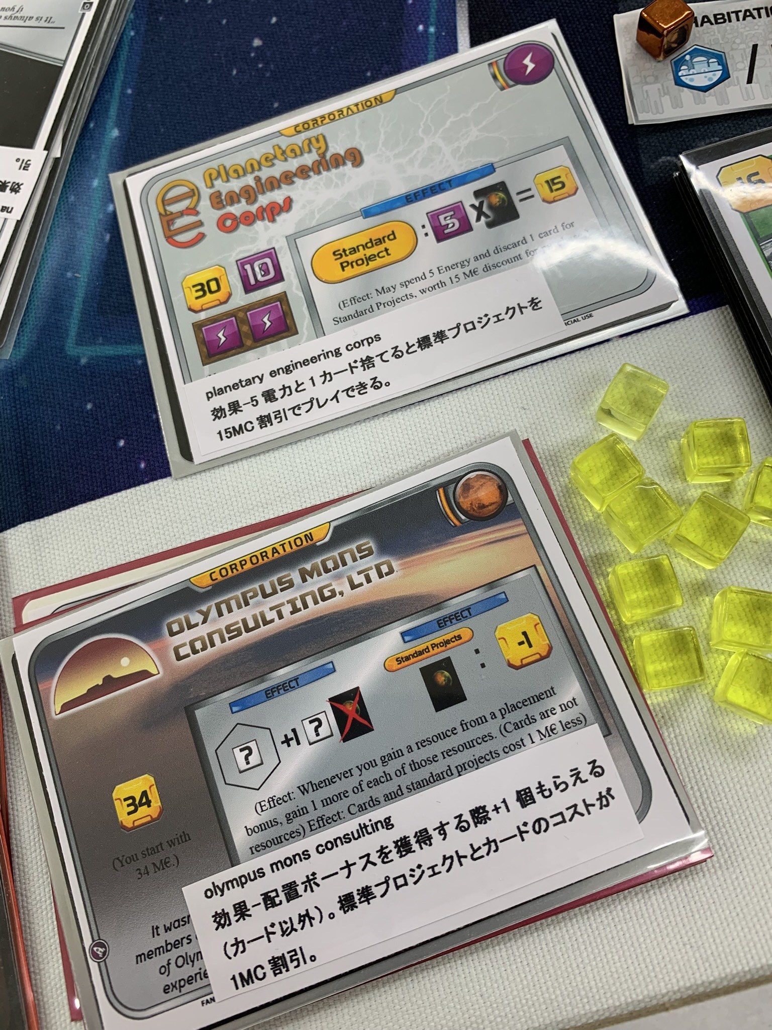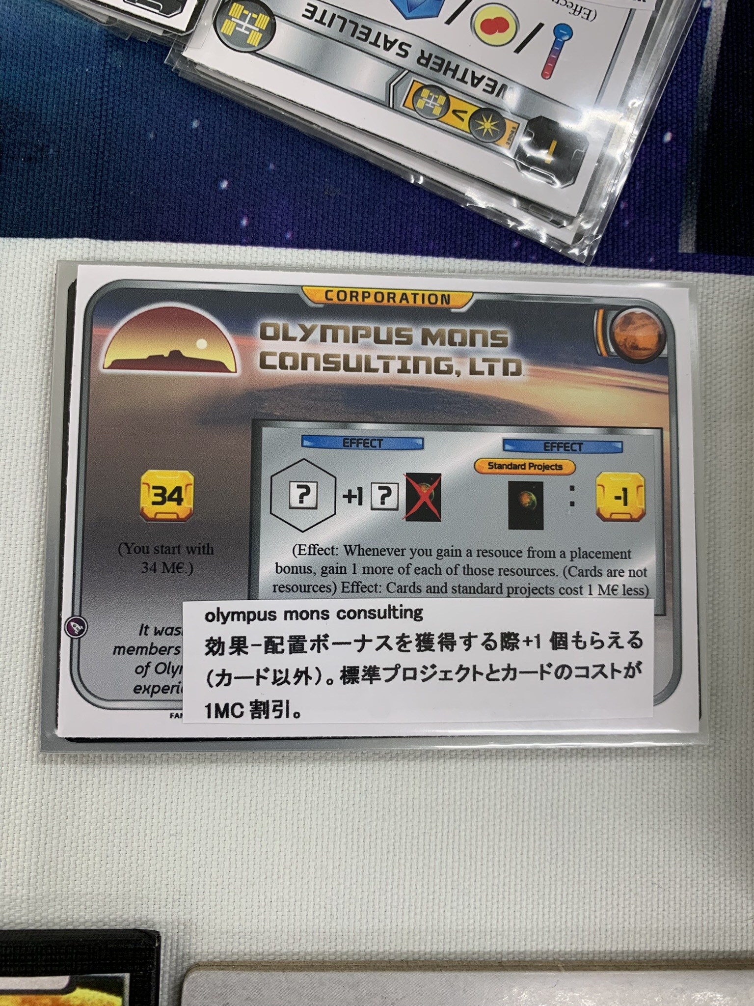 今日の企業その5「OLYMPIC MONS CONSULTING,LTD」。エピック環境はマップが広いのでこの効果を何度も享受できそう。標準プロジェクトの割引も工場に使えるので強いと思います。初期資金34MCは少ないけど効果が強いので仕方なし。