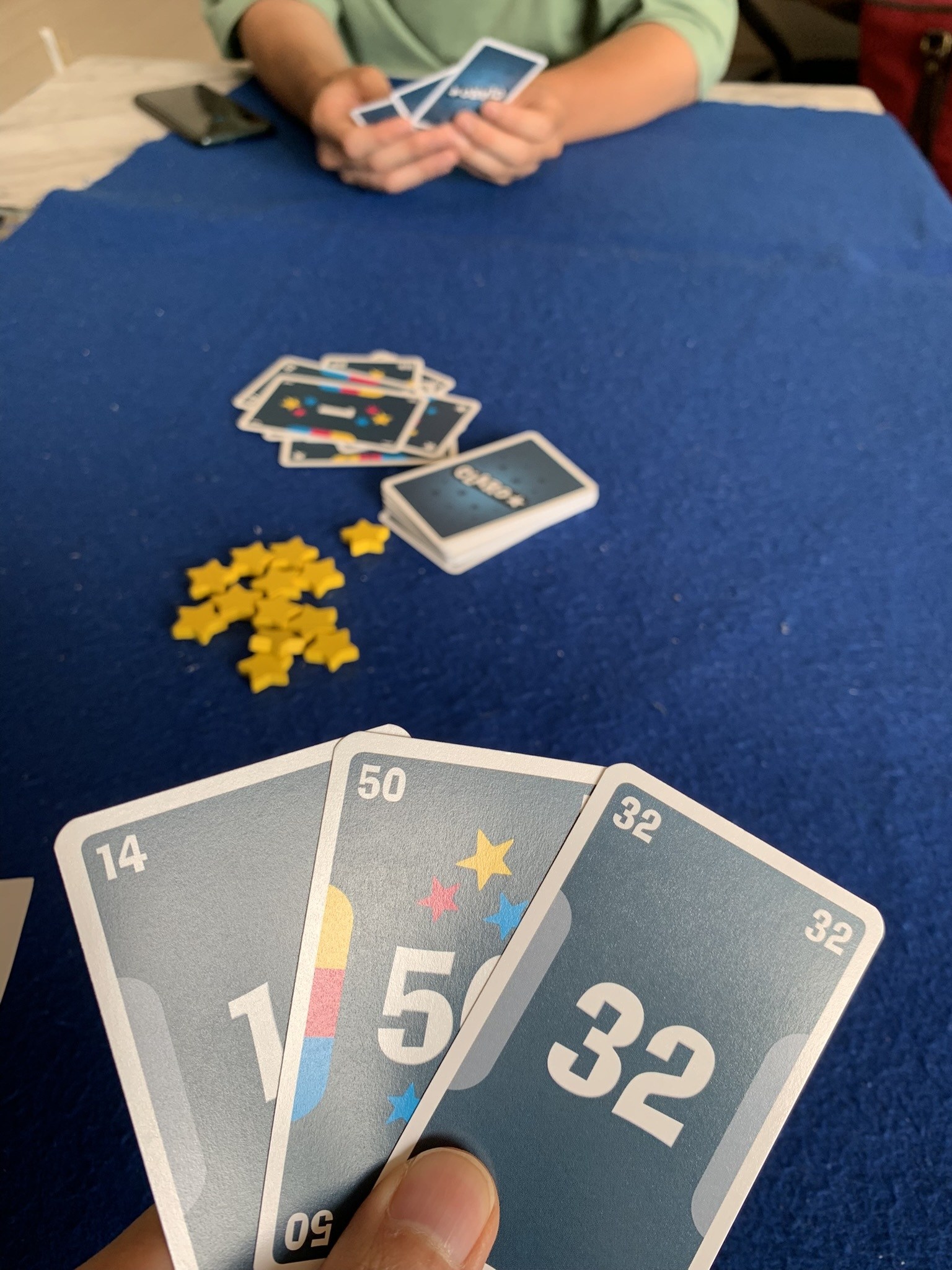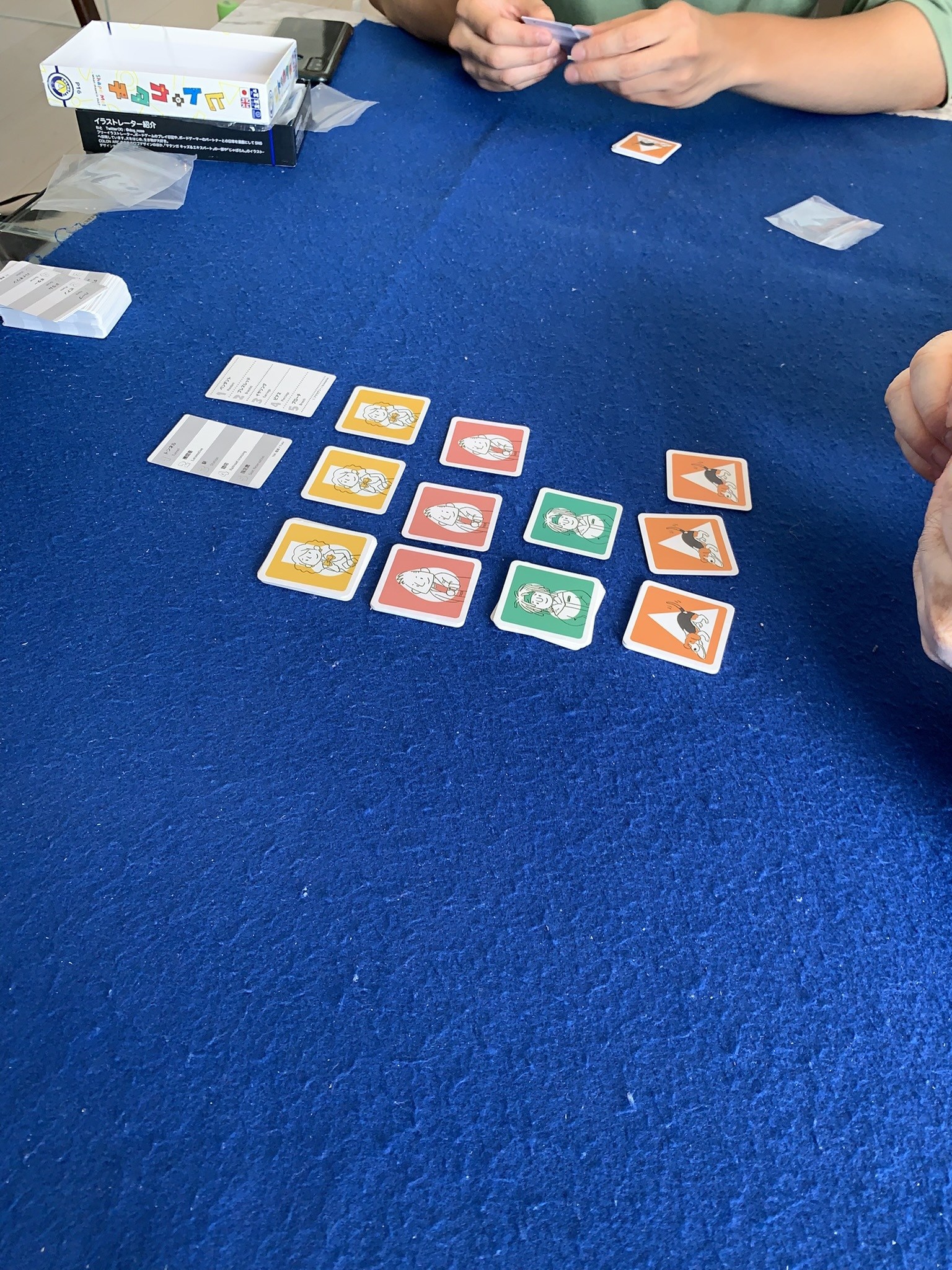 簡単なゴーアウト。基本的には数値が上がるようにカードを出していきますが、色が一致すれば低い数値でも出せるところが推しポイントです。「アップんダウン」と似て好きです。勝者はさっちゃん、お見事でした。