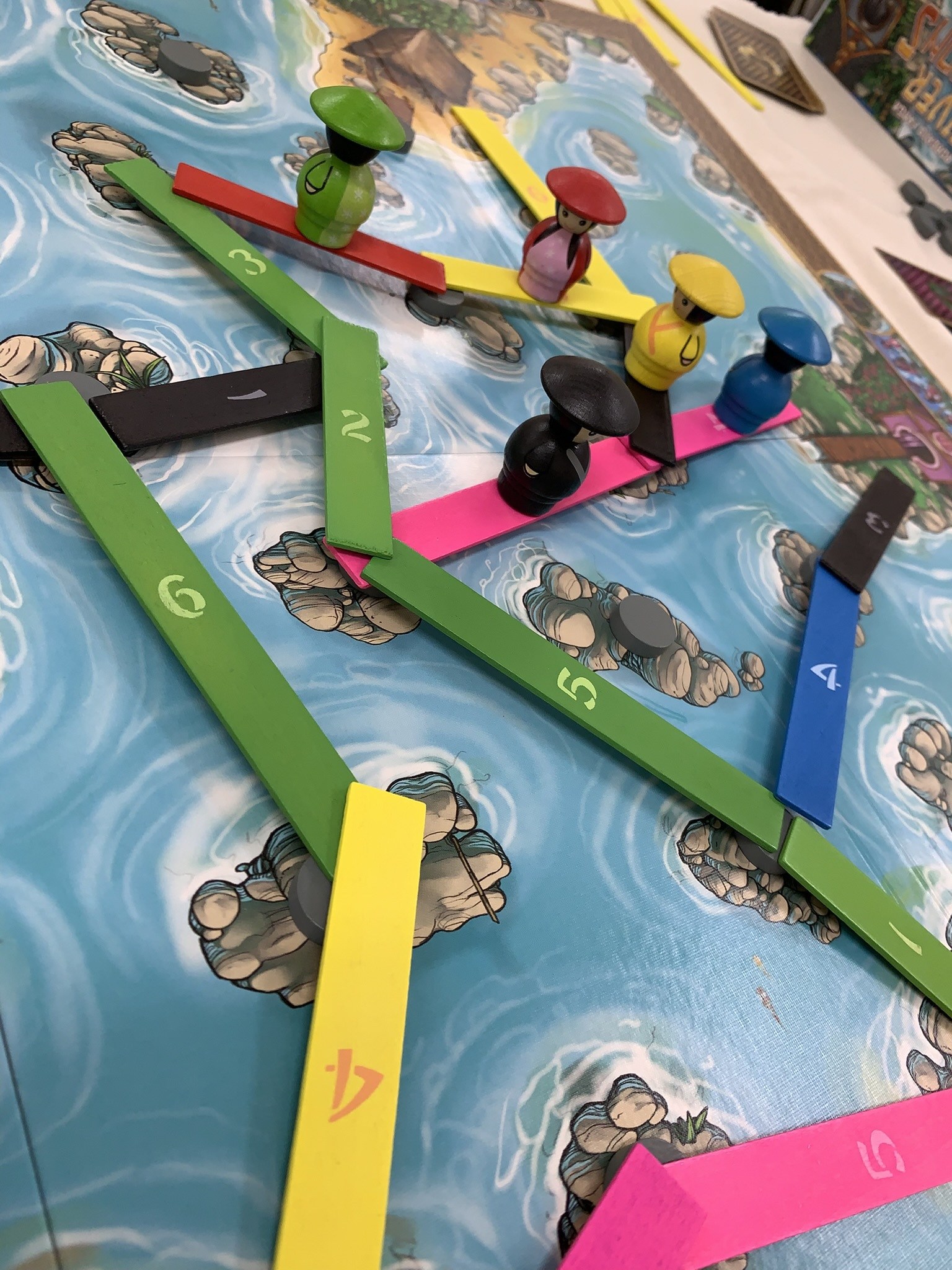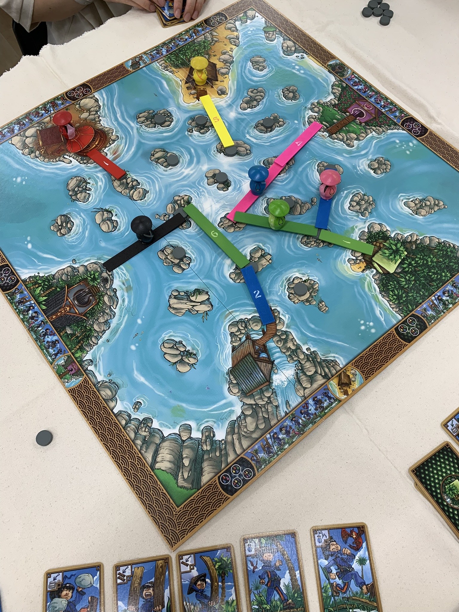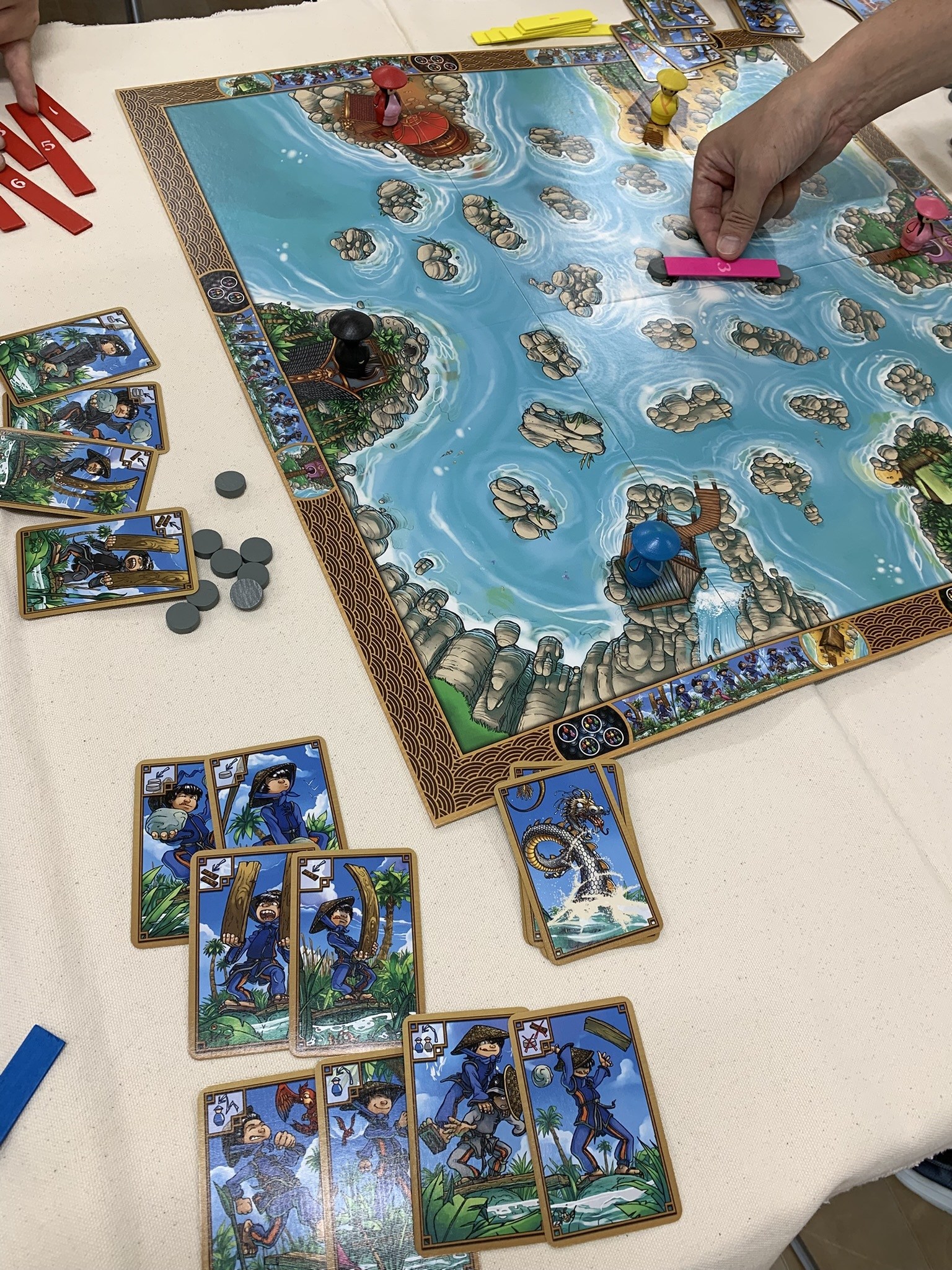 お次は田野cさんの持ち込みで橋渡しレースゲームのリヴァードラゴンを遊びました。「ドラゴンデルタ」のリメイクですね。プレイヤーコマもカードデザインも可愛くなってて遊ぶのも楽しいんじゃないでしょうか。勝者はたかみぃさん、お見事でした。