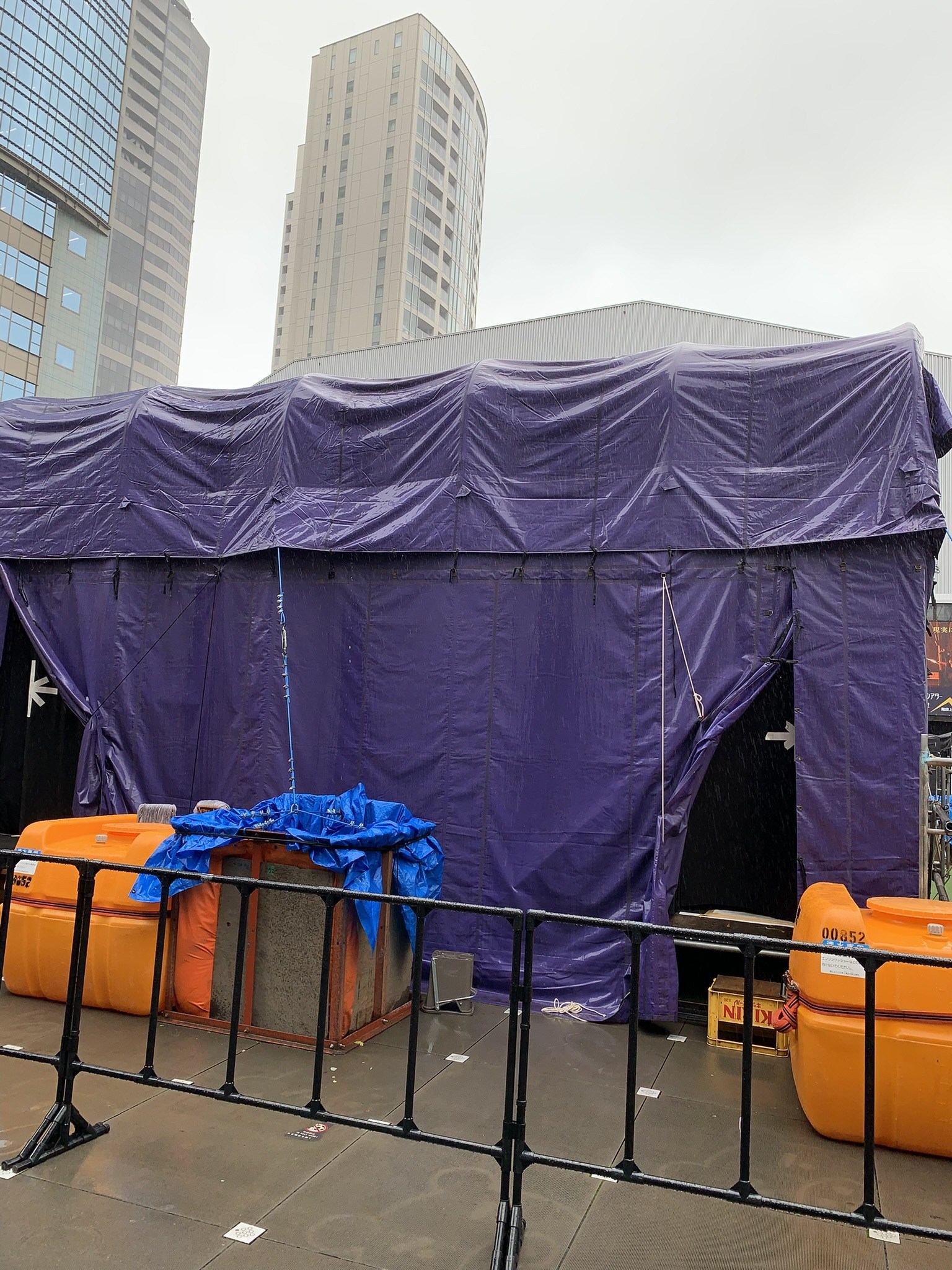 今日はあいにくの雨模様、天気が良ければあたりを散歩しようと思いましたがかなわず、テント周辺を歩くとテントの中から演者さんたちのアップする声が聞こえてきました。普段スズナリやトラムなど建物の中とはまた違った感じがよいですね。
