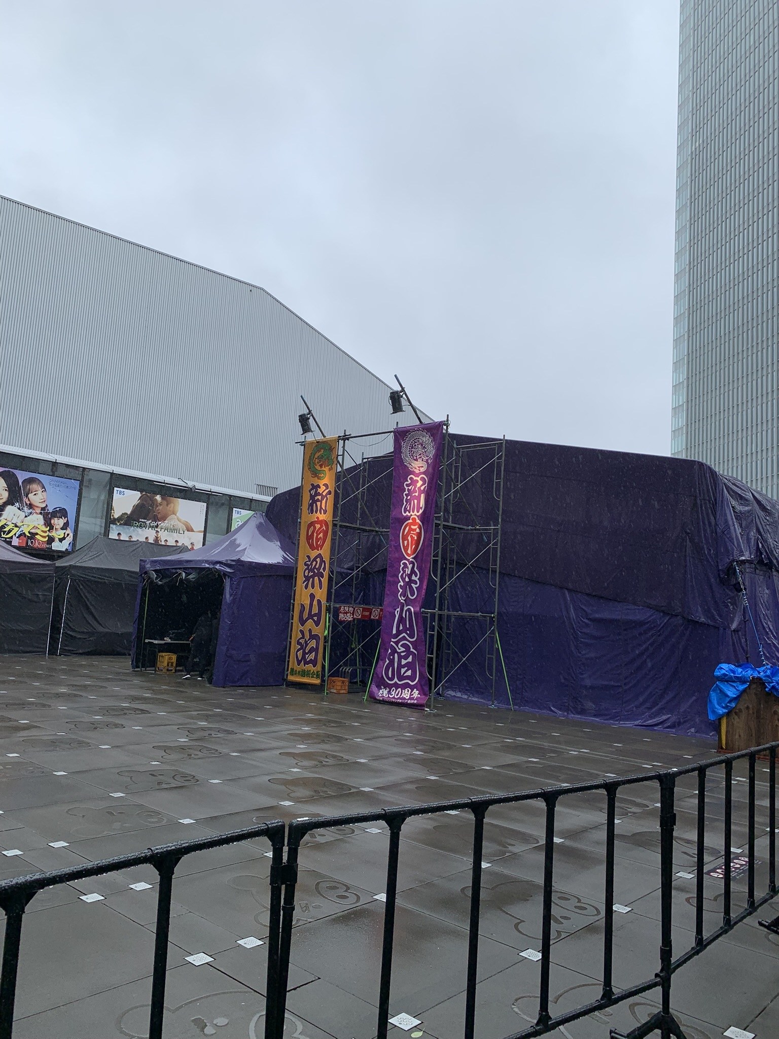 開場前の様子。敷地内にはお客さんはいなくて屋根のある通路にそれと思しき方が数名いるくらいでした。お客さんちゃんといるのだろうかと心配になるくらいでしたが実際は当日券を求める人もいてほぼ満員でした。