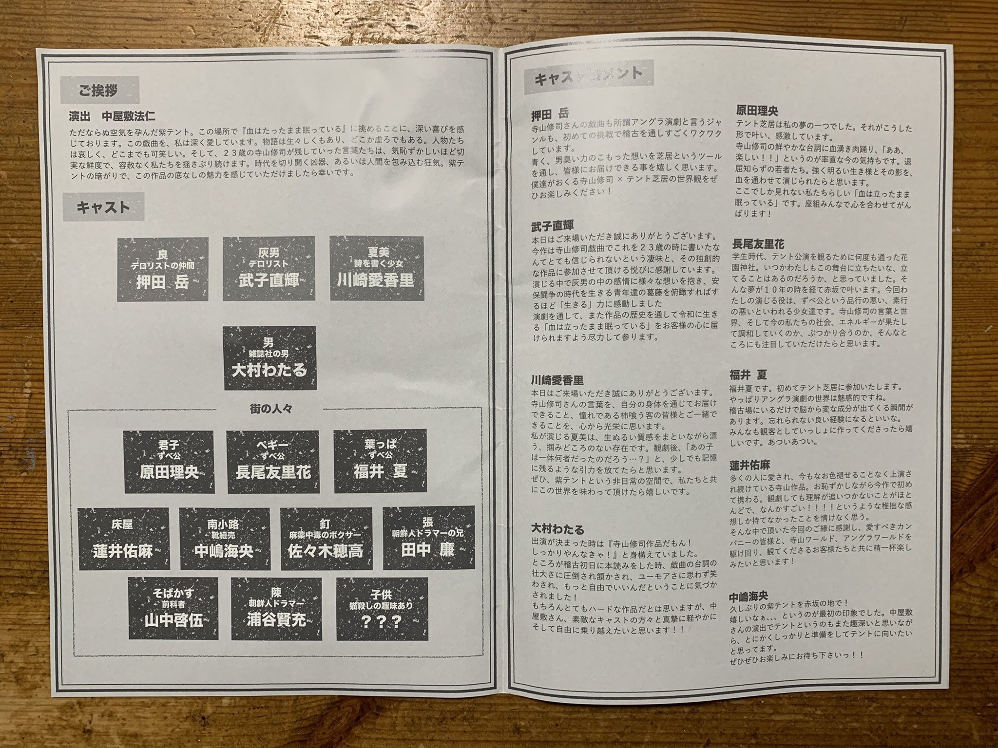 お話は舞台が六十年安保闘争時代を基にしているということでその時代の空気感を感じ取ろうとしましたが演者の熱量がとにかくすごかったですね(いつもながらの中屋敷法仁演出的に)。舞台と客席の広さはスズナリと同じくらいと思いましたけどテント公演ということもあって全体的に声の張りが若干強めな印象でした。そのため台詞が何割か聞き取れないことが続いたのが残念だったかな。若い方はもしかしたらちゃんと聞こえているのかもしれませんが(笑)